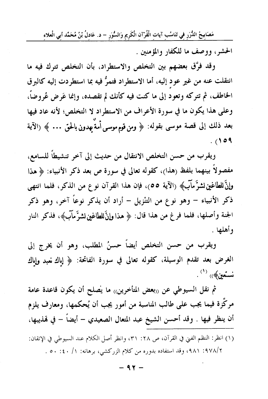 (1) انْظُر: النّظم الفني فِي الْقُرْآن، ص 28: 31، وَانْظُر أصل الْكَلَام عِنْد السُّيُوطِيّ فِي الإتقان: 2/978: 981، وَقد استفاده بدوره من كَلَام الزَّرْكَشِيّ، برهانه: 1/ 40: 50.