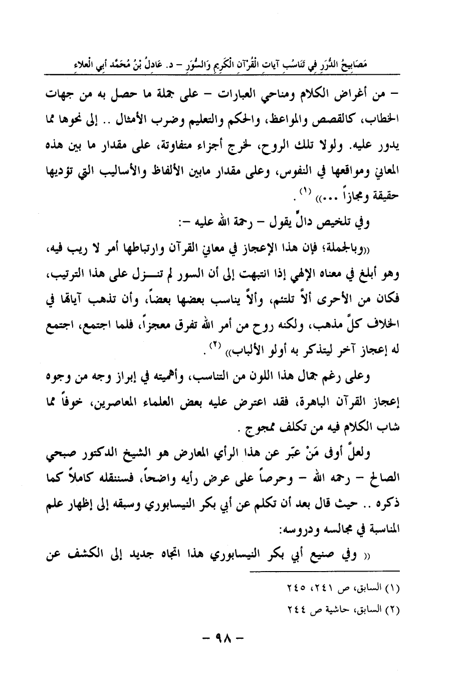 ولعلَّ أوفى مَنْ عبّر عَن هَذَا الرَّأْي الْمعَارض هُوَ الشَّيْخ الدكتور صبحي الصَّالح - رَحمَه الله -.. وحرصاً على عرض رَأْيه وَاضحا، فسننقله كَامِلا كَمَا ذكره.. حَيْثُ قَالَ بعد أَن تكلم عَن أبي بكر النَّيْسَابُورِي وَسَبقه إِلَى إِظْهَار علم الْمُنَاسبَة فِي مجالسه ودروسه: