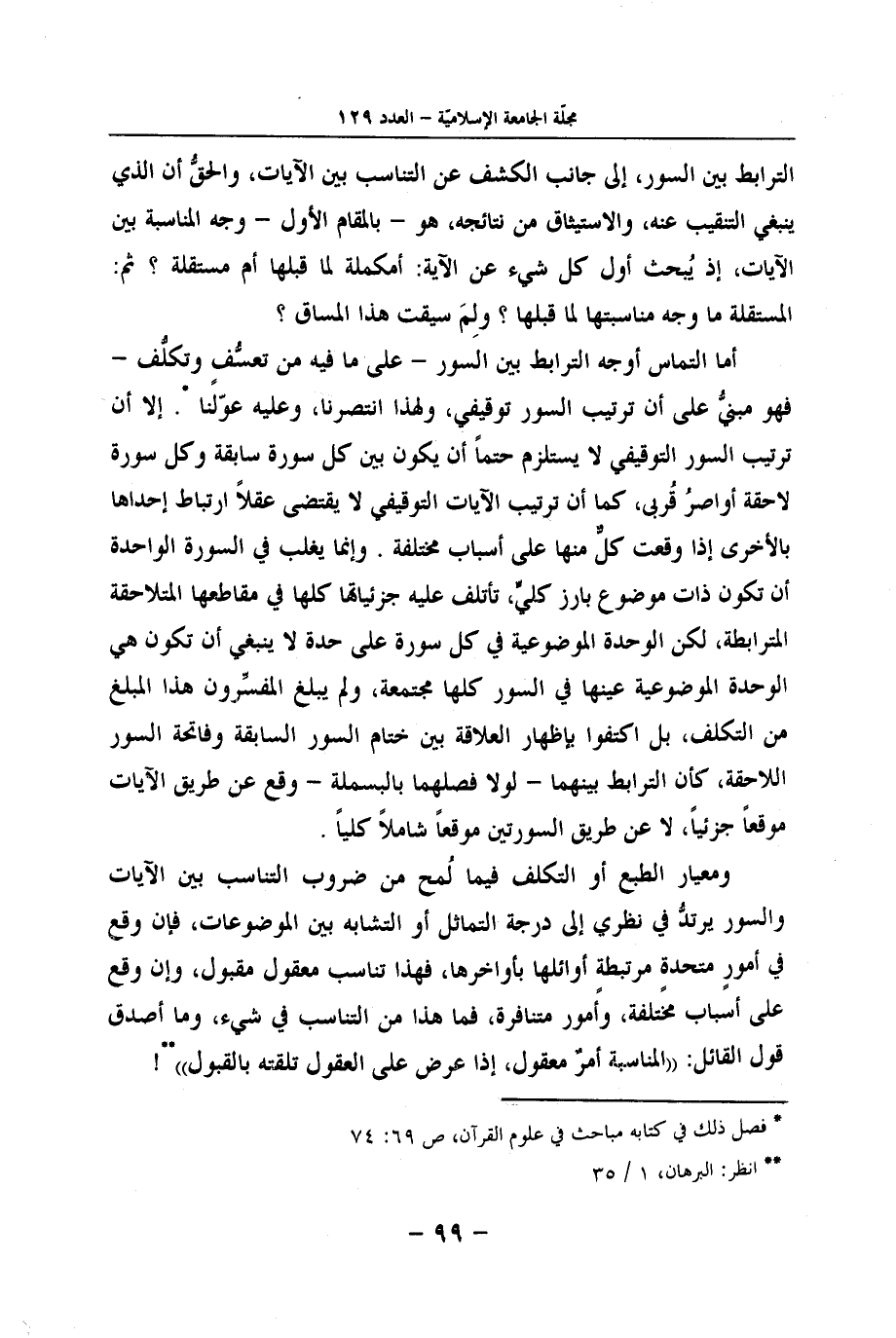 أما التمَاس أوجه الترابط بَين السُّور - على مَا فِيهِ من تعسُّفٍ وتكلُّف - فَهُوَ مبنيُّ على أَن تَرْتِيب السُّور توقيفي، وَلِهَذَا انتصرنا، وَعَلِيهِ عوّلنا. إِلَّا أَن تَرْتِيب السُّور التوقيفي لَا يسْتَلْزم حتما أَن يكون بَين كل سُورَة سَابِقَة وكل سُورَة لاحقة أواصرُ قُربى، كَمَا أَن تَرْتِيب الْآيَات التوقيفي لَا يقتضى عقلا ارتباط إِحْدَاهَا بِالْأُخْرَى إِذا وَقعت كلٌّ مِنْهَا على أَسبَاب مُخْتَلفَة. وَإِنَّمَا يغلب فِي السُّورَة الْوَاحِدَة أَن تكون ذَات مَوْضُوع بارز كليٍّ، تأتلف عَلَيْهِ جزئياتها كلهَا فِي مقاطعها المتلاحقة المترابطة، لَكِن الْوحدَة الموضوعية فِي كل سُورَة على حِدة لَا يَنْبَغِي أَن تكون هِيَ الْوحدَة الموضوعية عينهَا فِي السُّور كلهَا مجتمعة، وَلم يبلغ المفسِّرون هَذَا الْمبلغ من التَّكَلُّف، بل اكتفوا بِإِظْهَار العلاقة بَين ختام السُّور السَّابِقَة وفاتحة السُّور اللاحقة، كَأَن الترابط بَينهمَا - لَوْلَا فصلهما بالبسملة - وَقع عَن طَرِيق الْآيَات موقعاً جزئياً، لَا عَن طَرِيق السورتين موقعاً شَامِلًا كلياً.