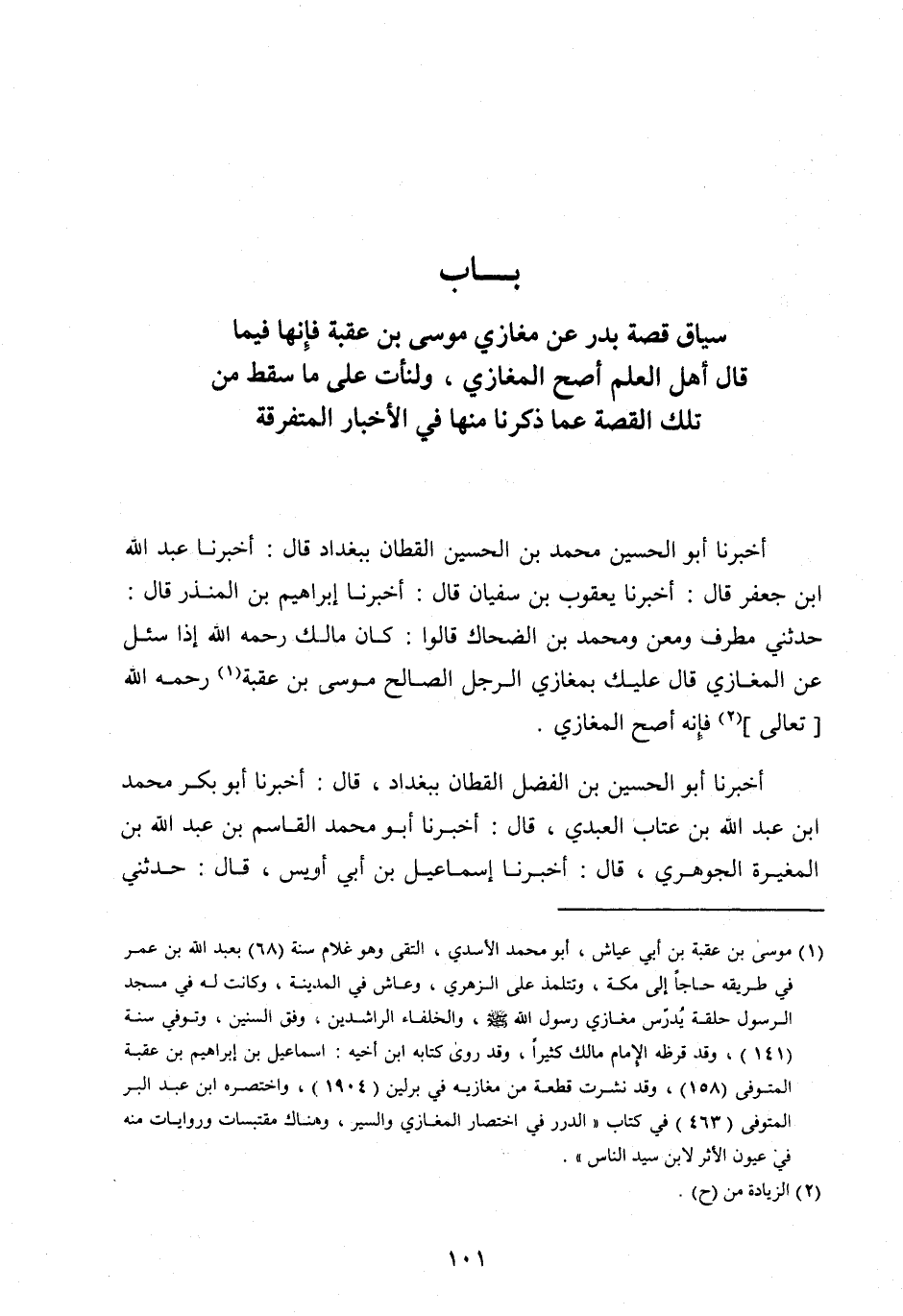 [ (1) ] موسى بْنِ عُقْبَةَ بْنِ أَبِي عياش، أبو محمد الأسدي، التقى وهو غلام سنة (68) بعبد اللهِ بْنِ عُمَرَ فِي طريقه حاجا إلى مكة، وتتلمذ على الزهري، وعاش في المدينة، وكانت له في مسجد الرسول حلقة يدرّس مَغَازِي رَسُولِ اللهِ صَلَّى اللَّه عليه وسلم، والخلفاء الراشدين، وفق السنين، وتوفي سنة (141) ، وقد قرظه الإمام مالك كثيرا، وقد روى كتابه ابن أخيه: إسماعيل بن إبراهيم بن عقبة المتوفى (158) ، وقد نشرت قطعة من مغازيه في برلين (1904) ، واختصره ابن عبد البر المتوفى (463) في كتاب «الدرر في اختصار المغازي والسير، وهناك مقتبسات وروايات منه في عيون الأثر لابن سيد الناس» .