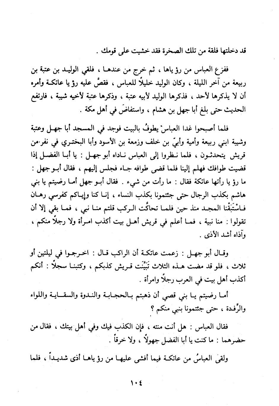 مَا رُؤْيَا رَأَتْهَا عَاتِكَةُ فَقَالَ: مَا رَأَتْ مِنْ شَيْءٍ. فَقَالَ أَبُو جَهْلٍ أَمَا رَضِيتُمْ يَا بَنِي هَاشِمٍ بِكَذِبِ الرِّجَالِ حَتَّى جِئْتُمُونَا بِكَذِبِ النِّسَاءِ، إنما كُنَّا وَإِيَّاكُمْ كَفَرَسَيْ رِهَانٍ فَاسْتَبَقْنَا الْمَجْدَ مُنْذُ حِينٍ فَلَمَّا تَحَاكَّتِ الرُّكَبُ قُلْتُمْ مِنَّا نَبِيٌّ، فَمَا بَقِيَ إِلَّا أَنْ تَقُولُوا: مِنَّا نَبِيَّةٌ، فَمَا أَعْلَمُ فِي قُرَيْشٍ أَهْلَ بَيْتٍ أَكْذَبَ امْرَأَةً وَلَا رَجُلًا مِنْكُمْ، وَآذَاهُ أَشَدَّ الْأَذَى.