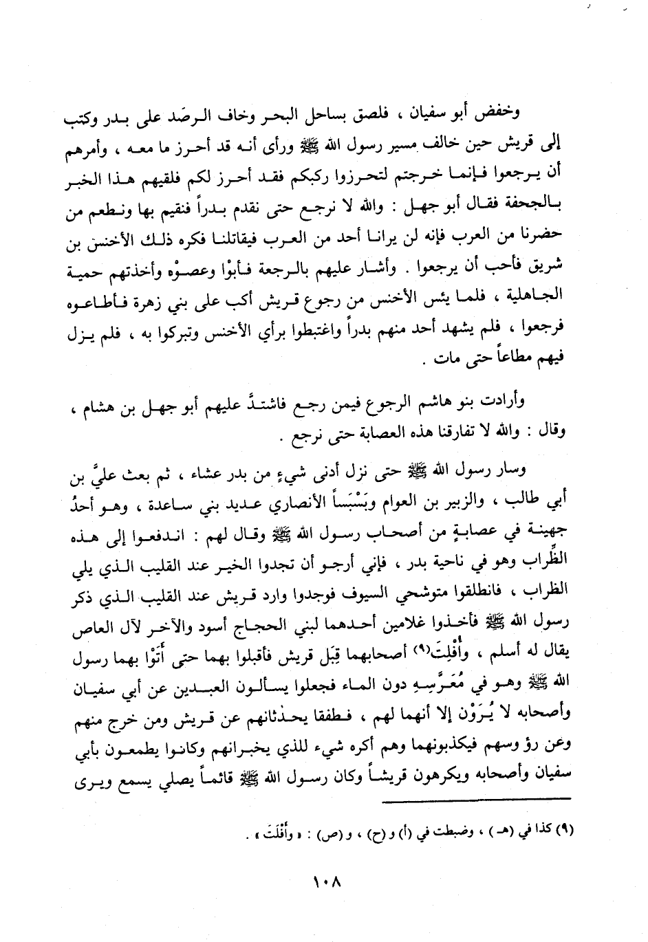وَخَفَضَ أَبُو سُفْيَانَ، فَلَصِقَ بِسَاحِلِ الْبَحْرِ وَخَافَ الرَّصَدَ عَلَى بَدْرٍ وَكَتَبَ إِلَى قُرَيْشٍ حِينَ خَالَفَ مَسِيرَ رَسُولِ اللَّه صَلَّى اللَّه عَلَيْهِ وَسَلَّمَ وَرَأَى أَنَّهُ قَدْ أَحْرَزَ مَا مَعَهُ، وَأَمَرَهُمْ أَنْ يَرْجِعُوا فَإِنَّمَا خَرَجْتُمْ لِتُحْرِزُوا رَكْبَكُمْ فَقَدْ أُحْرِزَ لَكُمْ فَلَقِيَهُمْ هَذَا الْخَبَرُ بِالْجُحْفَةِ فَقَالَ أَبُو جَهْلٍ: واللَّه لَا نَرْجِعُ حَتَّى نَقْدَمَ بَدْرًا فَنُقِيمَ بِهَا وَنُطْعِمَ مَنْ حَضَرَنَا مِنَ الْعَرَبِ فَإِنَّهُ لَنْ يَرَانَا أَحَدٌ مَنَ الْعَرَبِ فَيُقَاتِلَنَا فَكَرِهَ ذَلِكَ الْأَخْنَسُ بْنُ شَرِيقٍ فَأَحَبَّ أَنْ يَرْجِعُوا. وَأَشَارَ عَلَيْهِمْ بِالرَّجْعَةِ فَأَبَوْا وَعَصَوْهُ وَأَخَذَتْهُمْ حَمِيَّةُ الْجَاهِلِيَّةِ، فَلَمَّا يَئِسَ الْأَخْنَسُ مِنْ رُجُوعِ قُرَيْشٍ أَكَبَّ عَلَى بَنِي زُهْرَةَ فَأَطَاعُوهُ فَرَجَعُوا، فَلَمْ يَشْهَدْ أَحَدٌ مِنْهُمْ بَدْرًا وَاغْتَبَطُوا بِرَأْيِ الْأَخْنَسِ وَتَبَرَّكُوا بِهِ، فَلَمْ يَزَلْ فِيهِمْ مُطَاعًا حَتَّى مَاتَ.