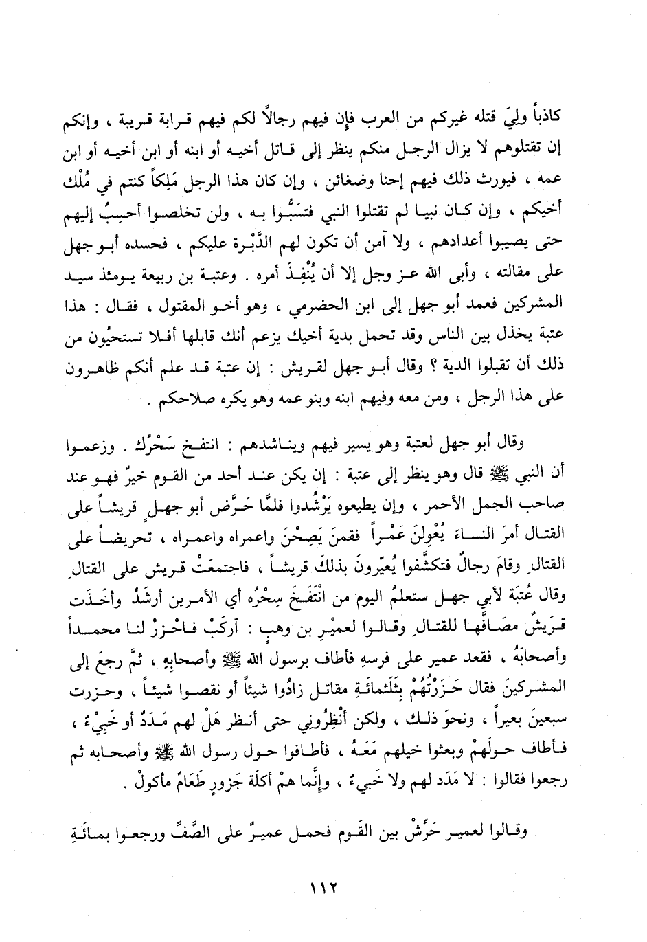 كَاذِبًا وَلِيَ قَتْلَهُ غَيْرُكُمْ مِنَ الْعَرَبِ فَإِنَّ فِيهِمْ رِجَالًا لَكُمْ فِيهِمْ قَرَابَةٌ قَرِيبَةٌ، وَإِنَّكُمْ إِنْ تَقْتُلُوهُمْ لَا يَزَالُ الرَّجُلُ مِنْكُمْ يَنْظُرُ إِلَى قَاتِلِ أَخِيهِ أَوِ ابْنِهِ أَوِ ابْنِ أَخِيهِ أَوِ ابْنِ عَمِّهِ، فَيُورِثُ ذَلِكَ فِيهِمْ إِحَنًا وَضَغَائِنَ، وَإِنْ كَانَ هَذَا الرَّجُلُ مَلِكًا كُنْتُمْ فِي مُلْكِ أَخِيكُمْ، وَإِنْ كَانَ نَبِيًّا لَمْ تَقْتُلُوَا النَّبِيَّ فَتُسَبُّوا بِهِ، وَلَنْ تَخْلُصُوا أَحْسَبُ إِلَيْهِمْ حَتَّى يُصِيبُوا أَعْدَادَهُمْ، وَلَا آمَنُ أَنْ تَكُونَ لَهُمُ الدَّبْرَةُ عَلَيْكُمْ، فَحَسَدَهُ أَبُو جَهْلٍ عَلَى مَقَالَتِهِ، وَأَبَى اللَّه عَزَّ وَجَلَّ إِلَّا أَنْ يُنْفِذَ أَمْرَهُ. وَعُتْبَةُ بْنُ رَبِيعَةَ يَوْمَئِذٍ سَيِّدُ الْمُشْرِكِينَ فَعَمَدَ أَبُو جَهْلٍ إِلَى ابْنِ الْحَضْرَمِيِّ، وَهُوَ أَخُو الْمَقْتُولِ، فَقَالَ: هَذَا عُتْبَةُ يُخَذِّلُ بَيْنَ النَّاسِ وَقَدْ تَحَمَّلَ بِدِيَةِ أَخِيكَ يَزْعُمُ أَنَّكَ قَابِلُهَا أَفَلَا تَسْتَحْيُونَ مِنْ ذَلِكَ أَنْ تَقْبَلُوا الدِّيَةَ؟ وَقَالَ أَبُو جَهْلٍ لِقُرَيْشٍ: إِنَّ عُتْبَةَ قَدْ عَلِمَ أَنَّكُمْ ظَاهِرُونَ عَلَى هَذَا الرَّجُلِ، وَمَنْ مَعَهُ وَفِيهِمُ ابْنُهُ وَبَنُو عَمِّهِ وَهُوَ يَكْرَهُ صَلَاحَكُمْ.