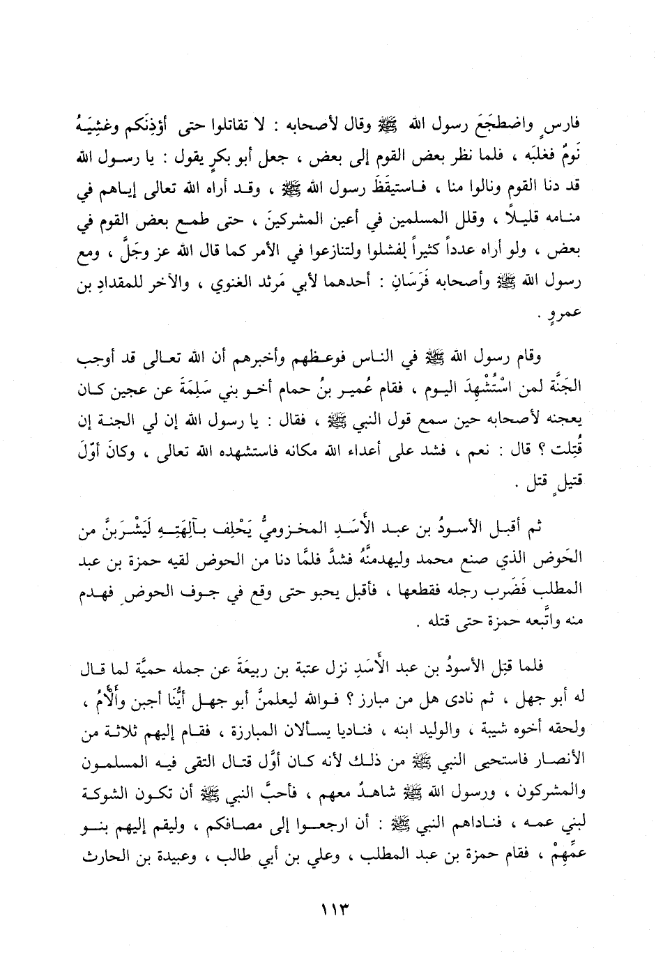 فَأَحَبَّ النَّبِيُّ صَلَّى اللَّه عَلَيْهِ وَسَلَّمَ أَنْ تَكُونَ الشَّوْكَةُ لِبَنِي عَمِّهِ، فَنَادَاهُمُ النَّبِيُّ صلى اللَّه عليه وسلم: أَنِ ارْجِعُوا إِلَى مَصَافِّكُمْ، وَلْيَقُمْ إِلَيْهِمْ بَنُو عَمِّهِمْ، فَقَامَ حَمْزَةُ بْنُ عَبْدِ الْمُطَّلِبِ، وَعَلِيُّ بْنُ أَبِي طَالِبٍ، وَعُبَيْدَةُ بْنُ الْحَارِثِ