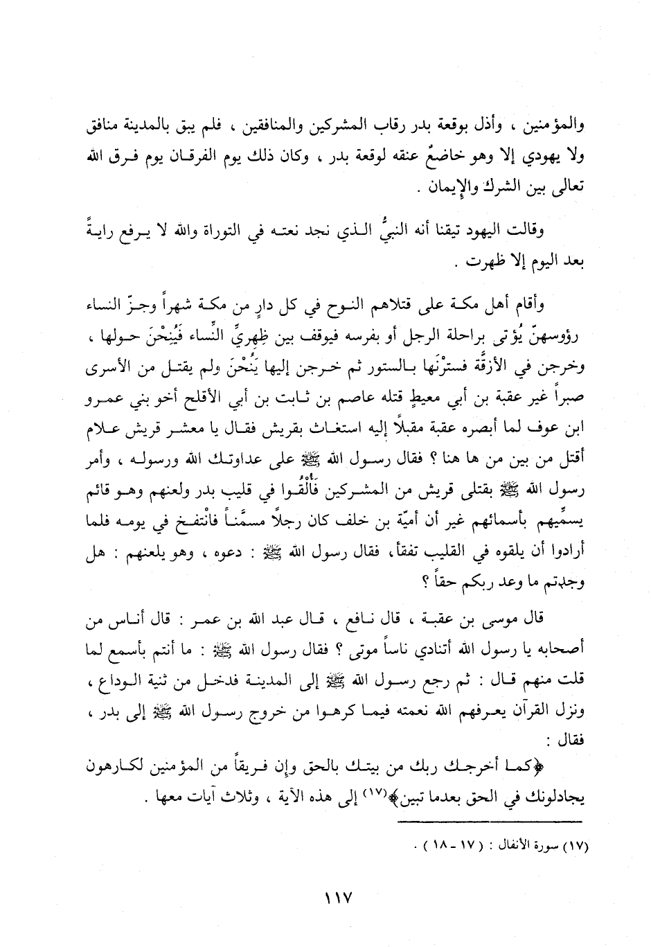 كَما أَخْرَجَكَ رَبُّكَ مِنْ بَيْتِكَ بِالْحَقِّ وَإِنَّ فَرِيقاً مِنَ الْمُؤْمِنِينَ لَكارِهُونَ يُجادِلُونَكَ فِي الْحَقِّ بَعْدَ ما تَبَيَّنَ [ (17) ] إِلَى هَذِهِ الْآيَةِ، وَثَلَاثِ آيات معها.