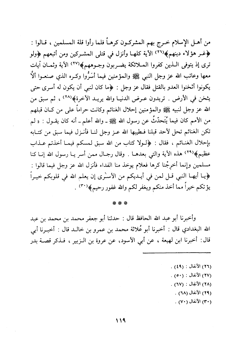 غَرَّ هؤُلاءِ دِينُهُمْ [ (26) ] الْآيَةَ كُلَّهَا وَأَنْزَلَ فِي قَتْلَى الْمُشْرِكِينَ وَمَنِ اتَّبَعَهُمْ وَلَوْ تَرى إِذْ يَتَوَفَّى الَّذِينَ كَفَرُوا الْمَلائِكَةُ يَضْرِبُونَ وُجُوهَهُمْ [ (27) ] الْآيَةَ وَثَمَانِ آيَاتٍ مَعَهَا وَعَاتَبَ اللَّه عَزَّ وَجَلَّ النبي صلى اللَّه عليه وَسَلَّمَ وَالْمُؤْمِنِينَ فِيمَا أَسَرُوا وَكَرِهَ الَّذِي صَنَعُوا أَلَّا يَكُونُوا أَثْخَنُوا الْعَدُوَّ بِالْقَتْلِ فَقَالَ عَزَّ وَجَلَّ: مَا كانَ لِنَبِيٍّ أَنْ يَكُونَ لَهُ أَسْرى حَتَّى يُثْخِنَ فِي الْأَرْضِ. تُرِيدُونَ عَرَضَ الدُّنْيا وَاللَّهُ يُرِيدُ الْآخِرَةَ [ (28) ] ، ثُمَّ سَبَقَ مِنَ اللَّه عَزَّ وَجَلَّ لِنَبِيِّهِ صَلَّى اللَّه عَلَيْهِ وَسَلَّمَ وَالْمُؤْمِنِينَ إحلال الغنائم وكان حَرَامًا عَلَى مَنْ كَانَ قَبْلَهُمْ مِنَ الْأُمَمِ كَانَ فِيمَا يُتَحَدَّثُ عَنْ رَسُولِ اللَّه صَلَّى اللَّه عليه وَسَلَّمَ- واللَّه أَعْلَمُ-