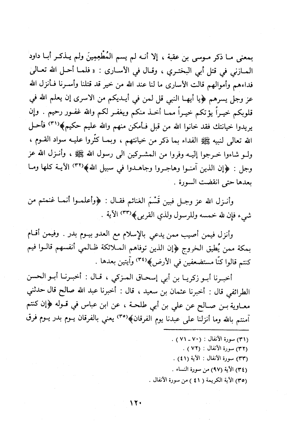 بِمَعْنَى مَا ذَكَرَ مُوسَى بْنُ عُقْبَةَ، إِلَّا أنه لَمْ يُسَمِّ الْمُطْعِمِينَ وَلَمْ يَذْكُرْ أَبَا دَاوُدَ الْمَازِنِيَّ فِي قَتْلِ أَبِي الْبَخْتَرِيِّ، وَقَالَ فِي الْأُسَارَى: «فَلَمَّا أَحَلَّ اللَّه تَعَالَى فِدَاءَهُمْ وَأَمْوَالَهُمْ قَالَتِ الْأُسَارَى مَا لَنَا عِنْدَ اللَّه مِنْ خَيْرٍ قَدْ قُتِلْنَا وَأُسِرْنَا فَأَنْزَلَ اللَّه عَزَّ وَجَلَّ يَسُرُّهُمْ يَا أَيُّهَا النَّبِيُّ قُلْ لِمَنْ فِي أَيْدِيكُمْ مِنَ الْأَسْرى إِنْ يَعْلَمِ اللَّهُ فِي قُلُوبِكُمْ خَيْراً يُؤْتِكُمْ خَيْراً مِمَّا أُخِذَ مِنْكُمْ وَيَغْفِرْ لَكُمْ وَاللَّهُ غَفُورٌ رَحِيمٌ. وَإِنْ يُرِيدُوا خِيانَتَكَ فَقَدْ خانُوا اللَّهَ مِنْ قَبْلُ فَأَمْكَنَ مِنْهُمْ وَاللَّهُ عَلِيمٌ حَكِيمٌ [ (31) ] فَأَحَلَّ اللَّه تَعَالَى لِنَبِيِّهِ صَلَّى اللَّه عَلَيْهِ وسلم الْفِدَاءَ بِمَا ذَكَرَ مِنْ خِيَانَتِهِمْ، وَبِمَا كَثَّرُوا عَلَيْهِ سَوَادَ الْقَوْمِ، وَلَوْ شَاءُوا خَرَجُوا إِلَيْهِ وَفَّرُوا مِنَ الْمُشْرِكِينَ إِلَى رَسُولِ اللَّه صَلَّى اللَّه عليه وسلم، وَأَنْزَلَ اللَّه عَزَّ وَجَلَّ: إِنَّ الَّذِينَ آمَنُوا وَالَّذِينَ هاجَرُوا وَجاهَدُوا فِي سَبِيلِ اللَّهِ [ (32) ] الْآيَةَ كُلَّهَا وَمَا بَعْدَهَا حَتَّى انْقَضَتِ السُّورَةُ.