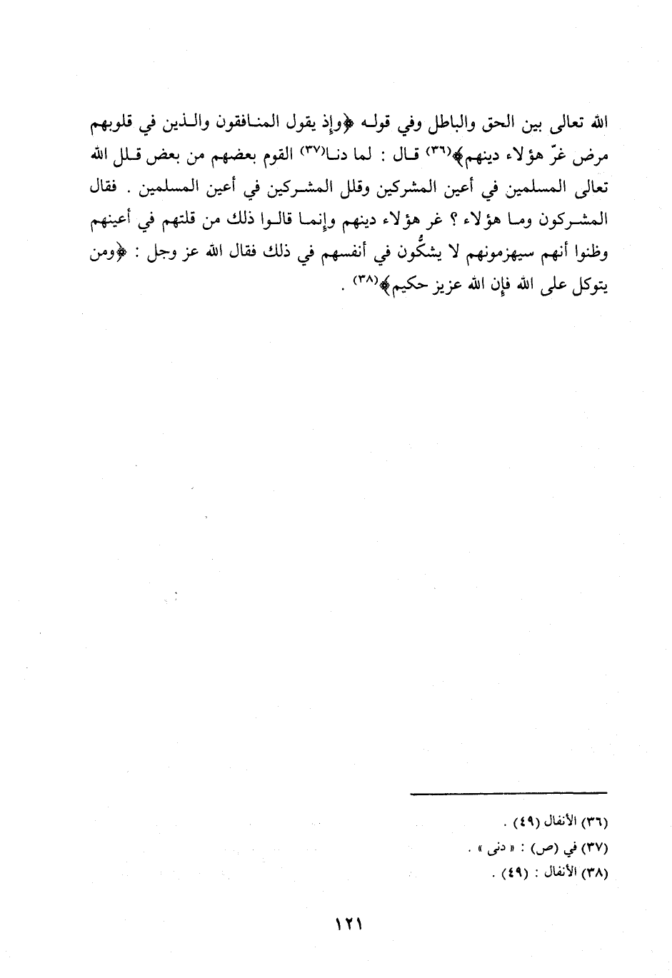 اللهُ تَعَالَى بَيْنَ الْحَقِّ وَالْبَاطِلِ وَفِي قَوْلِهِ إِذْ يَقُولُ الْمُنافِقُونَ وَالَّذِينَ فِي قُلُوبِهِمْ مَرَضٌ غَرَّ هؤُلاءِ دِينُهُمْ [ (36) ] قَالَ: لَمَّا دَنَا [ (37) ] الْقَوْمُ بَعْضُهُمْ مِنْ بَعْضٍ قَلَّلَ اللهُ تَعَالَى الْمُسْلِمِينَ فِي أَعْيُنِ الْمُشْرِكِينَ وَقَلَّلَ الْمُشْرِكِينَ فِي أَعْيُنِ الْمُسْلِمِينَ. فَقَالَ المشركون وما هؤلاء؟ غير هَؤُلَاءِ دِينُهُمْ وَإِنَّمَا قَالُوا ذلك من قتلهم فِي أَعْيُنِهِمْ وَظَنُّوا أَنَّهُمْ سَيَهْزِمُونَهُمْ لَا يَشُكُّونَ فِي أَنْفُسِهِمْ فِي ذَلِكَ فَقَالَ اللهُ عَزَّ وَجَلَّ: وَمَنْ يَتَوَكَّلْ عَلَى اللَّهِ فَإِنَّ اللَّهَ عَزِيزٌ حَكِيمٌ [ (38) ] .