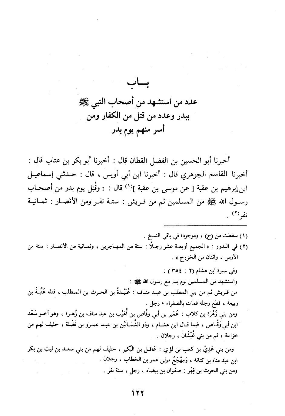 أَخْبَرَنَا الْقَاسِمُ الْجَوْهَرِيُّ قَالَ: أَخْبَرَنَا ابْنُ أَبِي أُوَيْسٍ، قَالَ: حَدَّثَنِي إِسْمَاعِيلُ ابن إِبْرَاهِيمَ بْنِ عُقْبَةَ [عَنْ مُوسَى بْنِ عُقْبَةَ] [ (1) ] قال: «وَقُتِلَ يَوْمَ بَدْرٍ مِنْ أَصْحَابِ رَسُولِ اللهِ صَلَّى اللَّه عَلَيْهِ وسلم مِنَ الْمُسْلِمِينَ ثُمَّ مِنْ قُرَيْشٍ: سِتَّةُ نَفَرٍ وَمَنَ الْأَنْصَارِ: ثمانية نفر [ (2) ] .