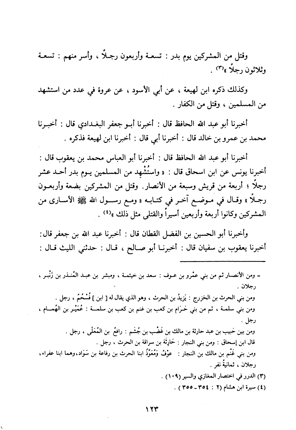 أَخْبَرَنَا يُونُسُ عَنِ ابْنِ إِسْحَاقَ قَالَ: «وَاسْتُشْهِدَ مِنَ الْمُسْلِمِينَ يَوْمَ بَدْرٍ أَحَدَ عَشَرَ رَجُلًا، أَرْبَعَةٌ مِنَ قُرَيْشٍ وَسَبْعَةٌ مِنَ الْأَنْصَارِ. وَقُتِلَ مِنَ الْمُشْرِكِينَ بِضْعَةٌ وَأَرْبَعُونَ رَجُلًا» وَقَالَ فِي مَوْضِعٍ آخَرَ فِي كِتَابِهِ «وَمَعَ رَسُولِ اللَّه صَلَّى اللَّه عليه وسلم الْأُسَارَى مِنَ الْمُشْرِكِينَ وَكَانُوا أَرْبَعَةً وَأَرْبَعِينَ أَسِيرًا وَالْقَتْلَى مِثْلُ ذَلِكَ» [ (4) ] .