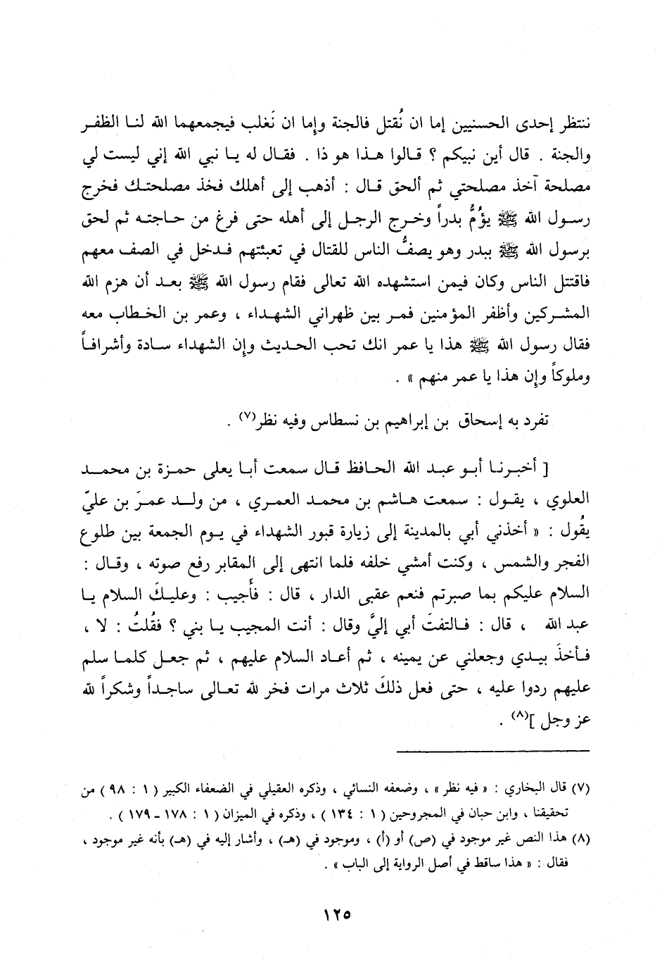 نَنْتَظِرُ إِحْدَى الْحُسْنَيَيْنِ إِمَّا أَنْ نُقْتَلَ فَالْجَنَّةُ وَإِمَّا ان نغلب فيجمعهما اللَّه لَنَا الظَّفَرُ وَالْجَنَّةُ. قَالَ أَيْنَ نَبِيُّكُمْ؟ قَالُوا هَذَا هُوَ ذَا. فَقَالَ لَهُ يَا نَبِيَّ اللَّه إِنِّي لَيْسَتْ لِي مَصْلَحَةٌ آخُذُ مَصْلَحَتِي ثُمَّ أَلْحَقُ قَالَ: اذْهَبْ إِلَى أَهْلِكَ فَخُذْ مَصْلَحَتَكَ فَخَرَجَ رَسُولُ اللَّه صَلَّى اللَّه عليه وَسَلَّمَ يَؤُمُّ بَدْرًا وَخَرَجَ الرَّجُلُ إِلَى أَهْلِهِ حَتَّى فَرَغَ مِنْ حَاجَتِهِ ثُمَّ لَحِقَ بِرَسُولِ اللَّه صَلَّى اللَّه عَلَيْهِ وَسَلَّمَ بِبَدْرٍ وَهُوَ يَصُفُّ النَّاسَ لِلْقِتَالِ فِي تَعْبِئَتِهِمْ فَدَخَلَ فِي الصَّفِّ مَعَهُمْ فَاقْتَتَلَ النَّاسُ وَكَانَ فِيمَنِ اسْتَشْهَدَهُ اللَّه تَعَالَى فَقَامَ رَسُولُ اللَّه صَلَّى اللَّه عَلَيْهِ وَسَلَّمَ بَعْدَ أَنْ هَزَمَ اللَّه الْمُشْرِكِينَ وَأَظْفَرَ الْمُؤْمِنِينَ فَمَرَّ بَيْنَ ظَهْرَانَيِ الشُّهَدَاءِ، وَعُمَرُ بْنُ الْخَطَّابِ مَعَهُ فَقَالَ رَسُولُ اللَّه صَلَّى اللَّه عَلَيْهِ وَسَلَّمَ هَذَا يَا عُمَرُ إِنَّكَ تُحِبُّ الْحَدِيثَ وإن الشهداء سادة وأشرافا وملوكا وَإِنَّ هَذَا يَا عُمَرُ مِنْهُمْ» .