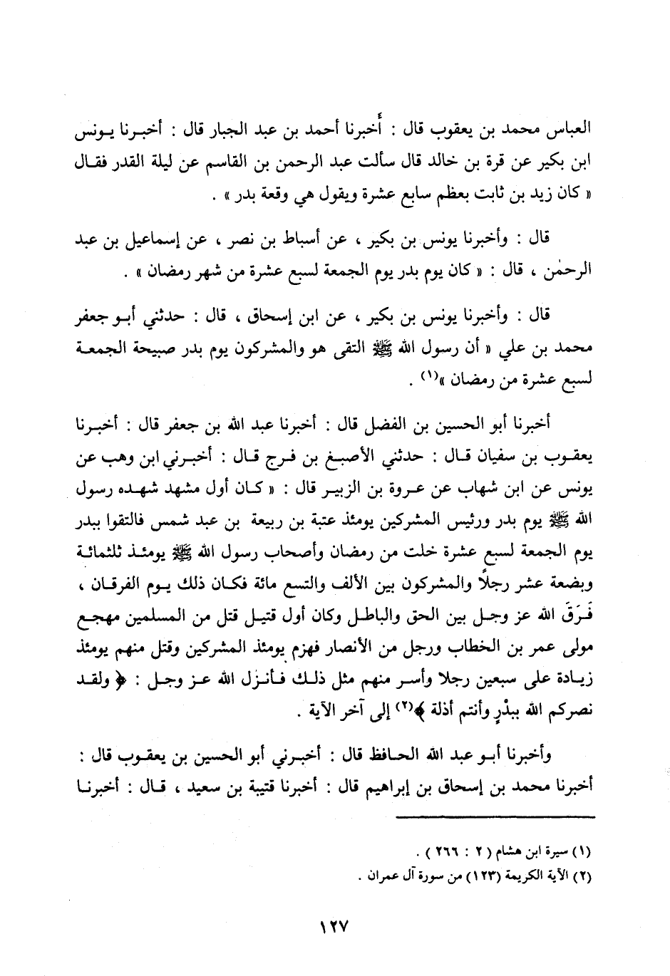 قَالَ: وأَخْبَرَنَا يُونُسُ بْنُ بُكَيْرٍ، عَنِ ابْنِ إِسْحَاقَ، قَالَ: حَدَّثَنِي أَبُو جَعْفَرٍ مُحَمَّدُ بْنُ عَلِيٍّ «إن رسول اللَّه صلى اللَّه عَلَيْهِ وَسَلَّمَ الْتَقَى هُوَ وَالْمُشْرِكُونَ يَوْمَ بَدْرٍ صَبِيحَةَ الْجُمُعَةِ لِسَبْعَ عَشْرَةَ مِنْ رَمَضَانَ» [ (1) ] .