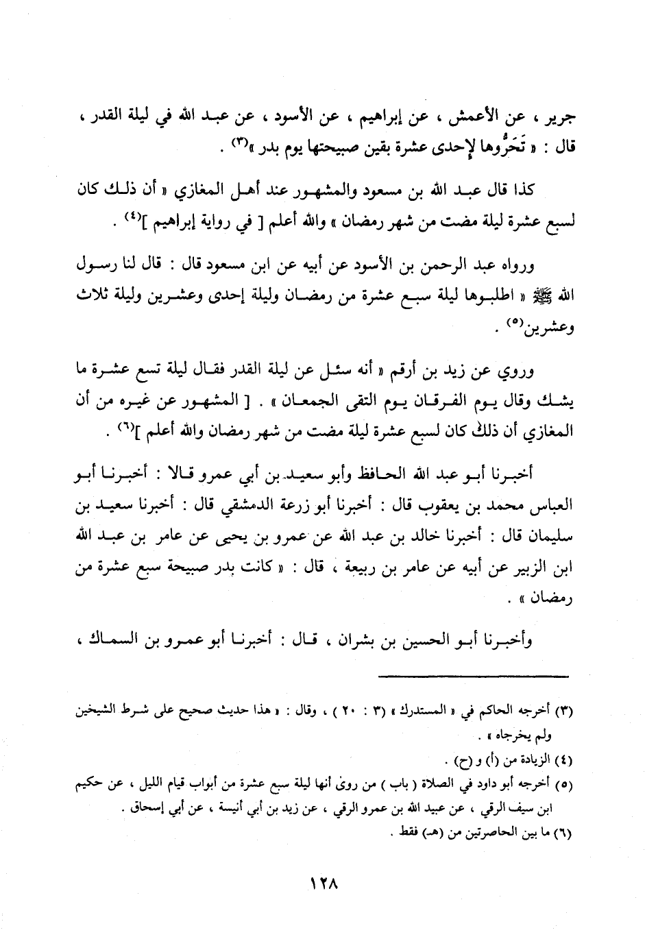 جَرِيرٌ، عَنِ الْأَعْمَشِ، عَنْ إِبْرَاهِيمَ، عَنِ الْأَسْوَدِ، عَنْ عَبْدِ اللَّه فِي لَيْلَةِ الْقَدْرِ، قَالَ: «تَحَرُّوهَا لِإِحْدَى عَشْرَةَ بَقِينَ صَبِيحَتُهَا يَوْمُ بَدْرٍ» [ (3) ] .