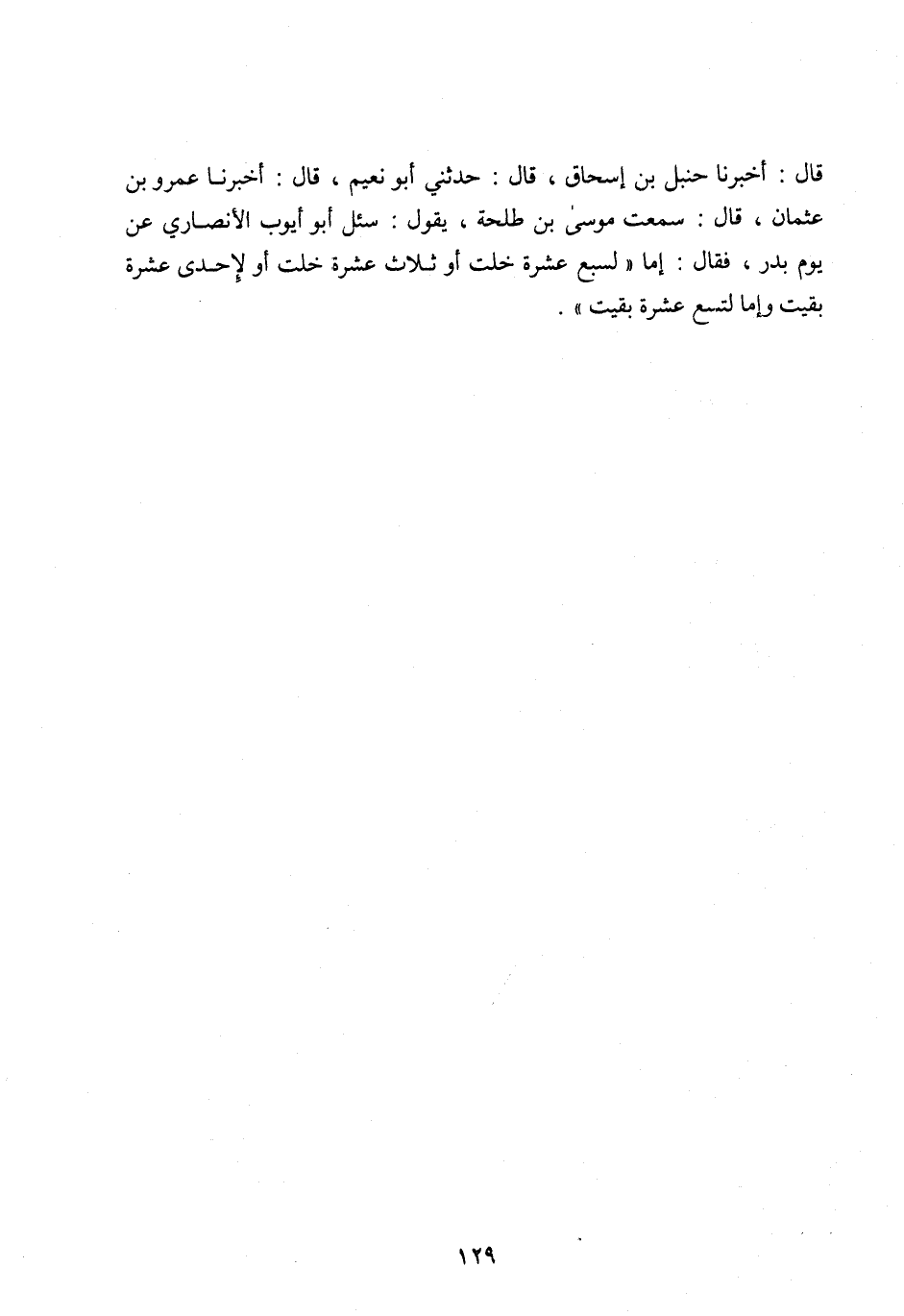 قَالَ: أَخْبَرَنَا حَنْبَلُ بْنُ إِسْحَاقَ، قَالَ: حَدَّثَنِي أَبُو نُعَيْمٍ، قَالَ: أَخْبَرَنَا عَمْرُو بْنُ عُثْمَانَ، قَالَ: سَمِعْتُ مُوسَى بْنَ طَلْحَةَ، يَقُولُ: سُئِلَ أَبُو أَيُّوبَ الْأَنْصَارِيُّ عَنْ يَوْمِ بَدْرٍ، فَقَالَ: إِمَّا «لِسَبْعَ عَشْرَةَ خَلَتْ أَوْ ثَلَاثَ عَشْرَةَ خَلَتْ أَوْ لِإِحْدَى عَشْرَةَ بَقِيَتْ وَإِمَّا لِتِسْعَ عَشْرَةَ بَقِيَتْ» .