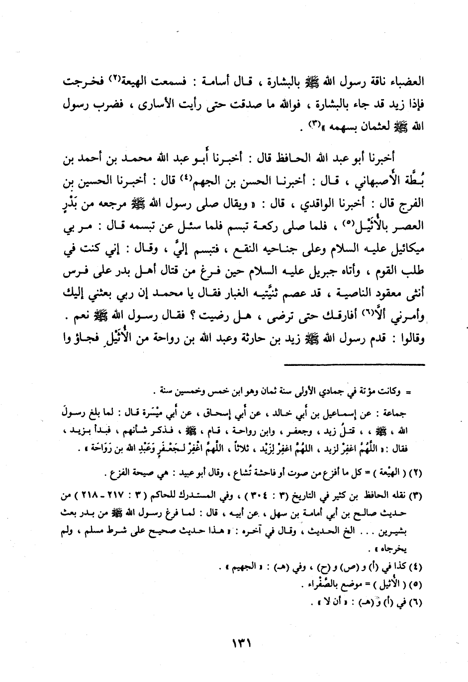 أَخْبَرَنَا أَبُو عَبْدِ اللهِ الْحَافِظُ قَالَ: أَخْبَرَنَا أَبُو عَبْدِ اللهِ مُحَمَّدُ بْنُ أَحْمَدَ بْنِ بُطَّةَ الْأَصْبَهَانِيُّ، قَالَ: أَخْبَرَنَا الْحَسَنُ بْنُ الْجَهْمِ [ (4) ] قَالَ: أَخْبَرَنَا الْحُسَيْنُ بْنُ الْفَرَجِ قَالَ: أَخْبَرَنَا الْوَاقِدِيُّ، قَالَ: «وَيُقَالُ صَلَّى رَسُولُ اللهِ صَلَّى اللَّه عليه وسلم مَرْجِعَهُ مِنْ بَدْرٍ الْعَصْرَ بِالْأُثَيْلِ [ (5) ] ، فَلَمَّا صَلَّى رَكْعَةً تَبَسَّمَ فَلَمَّا سُئِلَ عَنْ تَبَسُّمِهِ قَالَ: مَرَّ بِي مِيكَائِيلُ عَلَيْهِ السَّلَامُ وَعَلَى جَنَاحَيْهِ النَّقْعُ، فَتَبَسَّمَ إِلَيَّ، وَقَالَ: إِنِّي كُنْتُ فِي طَلَبِ الْقَوْمِ، وَأَتَاهُ جِبْرِيلُ عَلَيْهِ السَّلَامُ حِينَ فَرَغَ مِنْ قِتَالِ أَهْلِ بَدْرٍ عَلَى فَرَسٍ أُنْثَى مَعْقُودِ النَّاصِيَةِ، قَدْ عَصَمَ ثَنِيَّتَيْهِ الْغُبَارُ فَقَالَ يَا مُحَمَّدُ إِنَّ رَبِّي بَعَثَنِي إِلَيْكَ وَأَمَرَنِي أَلَا [ (6) ] أُفَارِقَكَ حَتَّى تَرْضَى، هَلْ رَضِيتَ؟ فَقَالَ رَسُولُ اللهِ صَلَّى اللَّه عَلَيْهِ وَسَلَّمَ نَعَمْ.