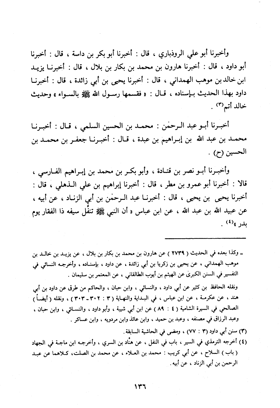 وأَخْبَرَنَا أَبُو عَلِيٍّ الرُّوذْبَارِيُّ، قَالَ: أَخْبَرَنَا أَبُو بَكْرِ بْنُ دَاسَةَ، قَالَ: أَخْبَرَنَا أَبُو دَاوُدَ، قَالَ: أَخْبَرَنَا هَارُونُ بْنُ مُحَمَّدِ بْنِ بَكَّارِ بْنِ بِلَالٍ، قَالَ: أخبرنا يزيد ابن خَالِدِ بْنِ مَوْهَبٍ الْهَمْدَانِيُّ، قَالَ: أَخْبَرَنَا يَحْيَى بْنُ أَبِي زَائِدَةَ، قَالَ: أَخْبَرَنَا دَاوُدُ بِهَذَا الْحَدِيثِ بِإِسْنَادِهِ، قَالَ: «فَقَسَمَهَا رَسُولُ اللَّه صَلَّى اللَّه عليه وسلم بِالسَّوَاءِ» وَحَدِيثُ خَالِدٍ أَتَمُّ [ (3) ] .