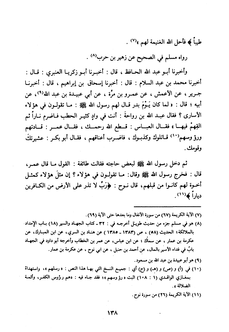 [ (8) ] هو في مسلم جزء من حديث طويل أخرجه في: 32- كتاب الجهاد والسير (18) باب الإمداد بالملائكة، الحديث (58) ، ص (1383- 1385) عَنْ هَنَّادِ بْنِ السَّرِيِّ، عن ابن المبارك، عَنْ عِكْرِمَةَ بْنِ عَمَّارٍ، عن سماك، عَنِ ابْنِ عَبَّاسٍ، عَنْ عُمَرَ بْنِ الْخَطَّابِ وأخرجه أبو داود في الجهاد باب في فداء الأسير بالمال، عَنْ أَحْمَدَ بْنَ حَنْبَلٍ، عَنِ ابي نوح، عَنْ عِكْرِمَةَ بْنِ عَمَّارٍ.
