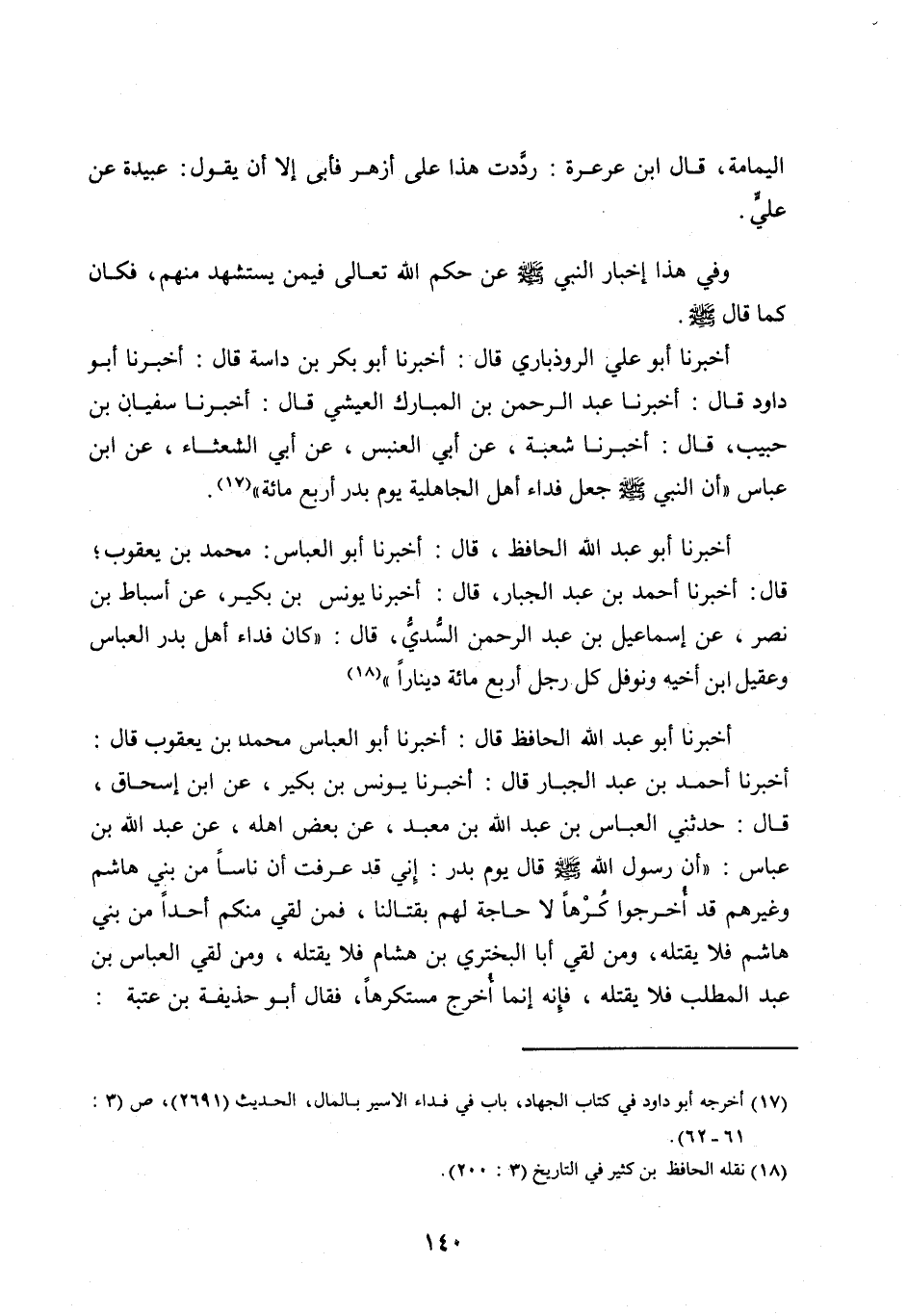 أَخْبَرَنَا أَبُو عَلِيٍّ الرُّوذْبَارِيُّ قَالَ: أَخْبَرَنَا أَبُو بَكْرِ بْنُ دَاسَةَ قَالَ: أَخْبَرَنَا أَبُو دَاوُدَ قَالَ: أَخْبَرَنَا عَبْدُ الرَّحْمَنِ بْنُ الْمُبَارَكِ الْعَيْشِيُّ قَالَ: أَخْبَرَنَا سُفْيَانُ بْنُ حَبِيبٍ، قَالَ: أَخْبَرَنَا شُعْبَةُ، عَنْ أَبِي الْعَنْبَسِ، عَنْ أَبِي الشَّعْثَاءِ، عَنِ ابْنِ عَبَّاسٍ «أَنَّ النَّبِيَّ صَلَّى اللَّه عليه وَسَلَّمَ جَعَلَ فِدَاءَ أَهْلِ الجاهلية يوم بدر أَرْبَعَ مِائَةٍ» [ (17) ] .