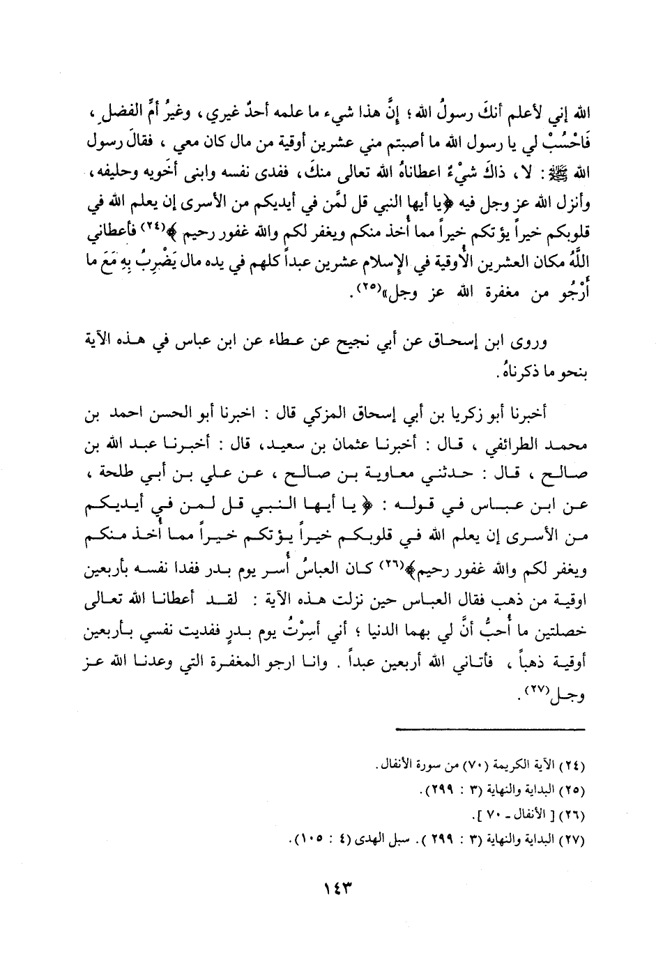 اللَّه إِنِّي لَأَعْلَمُ أَنَّكَ رَسُولُ اللَّه، إِنَّ هَذَا شَيْءٌ مَا عَلِمَهُ أَحَدٌ غَيْرِي، وَغَيْرَ أُمِّ الْفَضْلِ، فَاحْسُبْ لِي يَا رَسُولَ اللَّه مَا أَصَبْتُمْ مِنِّي عِشْرِينَ أُوقِيَّةً مِنْ مَالٍ كَانَ مَعِي، فَقَالَ رَسُولُ اللَّه صَلَّى اللَّه عَلَيْهِ وَسَلَّمَ: لَا، ذَاكَ شَيْءٌ أَعْطَانَاهُ اللَّه تَعَالَى مِنْكَ، فَفَدَى نَفْسَهُ وَابْنَيْ أَخَوَيْهِ وَحَلِيفَهُ، وَأَنْزَلَ اللَّه عَزَّ وَجَلَّ فِيهِ يَا أَيُّهَا النَّبِيُّ قُلْ لِمَنْ فِي أَيْدِيكُمْ مِنَ الْأَسْرى إِنْ يَعْلَمِ اللَّهُ فِي قُلُوبِكُمْ خَيْراً يُؤْتِكُمْ خَيْراً مِمَّا أُخِذَ مِنْكُمْ وَيَغْفِرْ لَكُمْ وَاللَّهُ غَفُورٌ رَحِيمٌ [ (24) ] فَأَعْطَانِي اللَّه مَكَانَ الْعِشْرِينَ الْأُوقِيَّةِ فِي الْإِسْلَامِ عِشْرِينَ عَبْدًا كُلُّهُمْ فِي يَدِهِ مَالٌ يَضْرِبُ بِهِ مَعَ مَا أَرْجُو مِنْ مَغْفِرَةِ اللَّه عَزَّ وَجَلَّ» [ (25) ] .