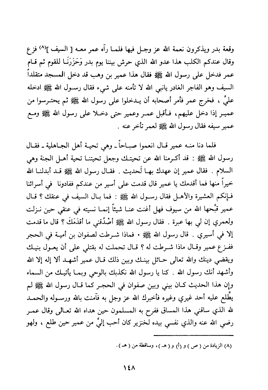 فَلَمَّا دَنَا مِنْهُ عُمَيْرٌ قَالَ أَنْعِمُوا صَبَاحًا- وَهِيَ تَحِيَّةُ أَهْلِ الْجَاهِلِيَّةِ- فَقَالَ رَسُولُ اللَّه صَلَّى اللَّه عَلَيْهِ وَسَلَّمَ: قَدْ أَكْرَمَنَا اللَّه عَنْ تَحِيَّتِكَ وَجَعَلَ تَحِيَّتَنَا تَحِيَّةَ أَهْلِ الْجَنَّةِ وَهِيَ السَّلَامُ. فَقَالَ عُمَيْرٌ إِنَّ عَهْدَكَ بِهَا لِحَدِيثٌ. فَقَالَ رَسُولُ اللَّه صَلَّى اللَّه عليه وسلم قَدْ أَبْدَلَنَا اللَّه خَيْرًا مِنْهَا فَمَا أَقْدَمَكَ يَا عُمَيْرُ قَالَ قَدِمْتُ عَلَى أَسِيرٍ مِنْ عِنْدِكُمْ فَفَادُونَا فِي أُسَرَائِنَا فَإِنَّكُمُ الْعَشِيرَةُ وَالْأَهْلُ فَقَالَ رَسُولُ اللَّه صَلَّى اللَّه عَلَيْهِ وَسَلَّمَ: فَمَا بَالُ السَّيْفِ فِي عُنُقِكَ؟ قَالَ عُمَيْرٌ قَبَّحَهَا اللَّه مِنْ سُيوفٍ فَهَلْ أَغْنَتْ عَنَّا شَيْئًا إِنَّمَا نَسِيتُهُ فِي عُنُقِي حِينَ نَزَلْتُ وَلَعَمْرِي إِنَّ لِي بِهَا عِبْرَةً. فَقَالَ رَسُولُ اللَّه صَلَّى اللَّه عَلَيْهِ وَسَلَّمَ اصْدُقْنِي مَا أَقْدَمَكَ؟ قَالَ مَا قَدِمْتُ إِلَّا فِي أَسِيرِي. قَالَ رَسُولُ اللَّه صَلَّى اللَّه عليه وسلم. فَمَاذَا شَرَطْتَ لِصَفْوَانَ بْنِ أُمَيَّةَ فِي الْحِجْرِ فَفَزِعَ عُمَيْرٌ وَقَالَ مَاذَا شَرَطْتُ لَهُ؟ قَالَ تَحَمَّلْتَ لَهُ بِقَتْلَى عَلَى أَنْ يَعُولَ بَنِيكَ وَيَقْضِي دَيْنَكَ واللَّه تَعَالَى حَائِلٌ بَيْنَكَ وَبَيْنَ ذَلِكَ قَالَ عُمَيْرٌ أَشْهَدُ أَلَّا إِلَهَ إِلَّا اللَّه وَأَشْهَدُ أَنَّكَ رَسُولُ اللَّه. كُنَّا يَا رَسُولَ اللَّه نُكَذِّبُكَ بِالْوَحْيِ وَبِمَا يَأْتِيكَ مِنَ السَّمَاءِ وَإِنَّ هَذَا الْحَدِيثَ كَانَ بَيْنِي وَبَيْنَ صَفْوَانَ فِي الْحِجْرِ كَمَا قَالَ رَسُولُ اللَّه صَلَّى اللَّه عَلَيْهِ وسلم لم يَطَّلِعْ عَلَيْهِ أَحَدٌ غَيْرِي وَغَيْرَهُ فَأَخْبَرَكَ اللَّه عَزَّ وَجَلَّ بِهِ فَآمَنْتُ بِاللهِ وَرَسُولِهِ وَالْحَمْدُ لِلَّهِ الَّذِي سَاقَنِي هَذَا الْمَسَاقَ فَفَرِحَ بِهِ الْمُسْلِمُونَ حِينَ هَدَاهُ اللَّه تَعَالَى وَقَالَ عُمَرُ رَضِيَ اللَّه عَنْهُ وَالَّذِي نَفْسِي بِيَدِهِ لَخِنْزِيرٌ كَانَ أَحَبَّ إِلَيَّ مِنْ عُمَيْرٍ حين طلع، ولهو
