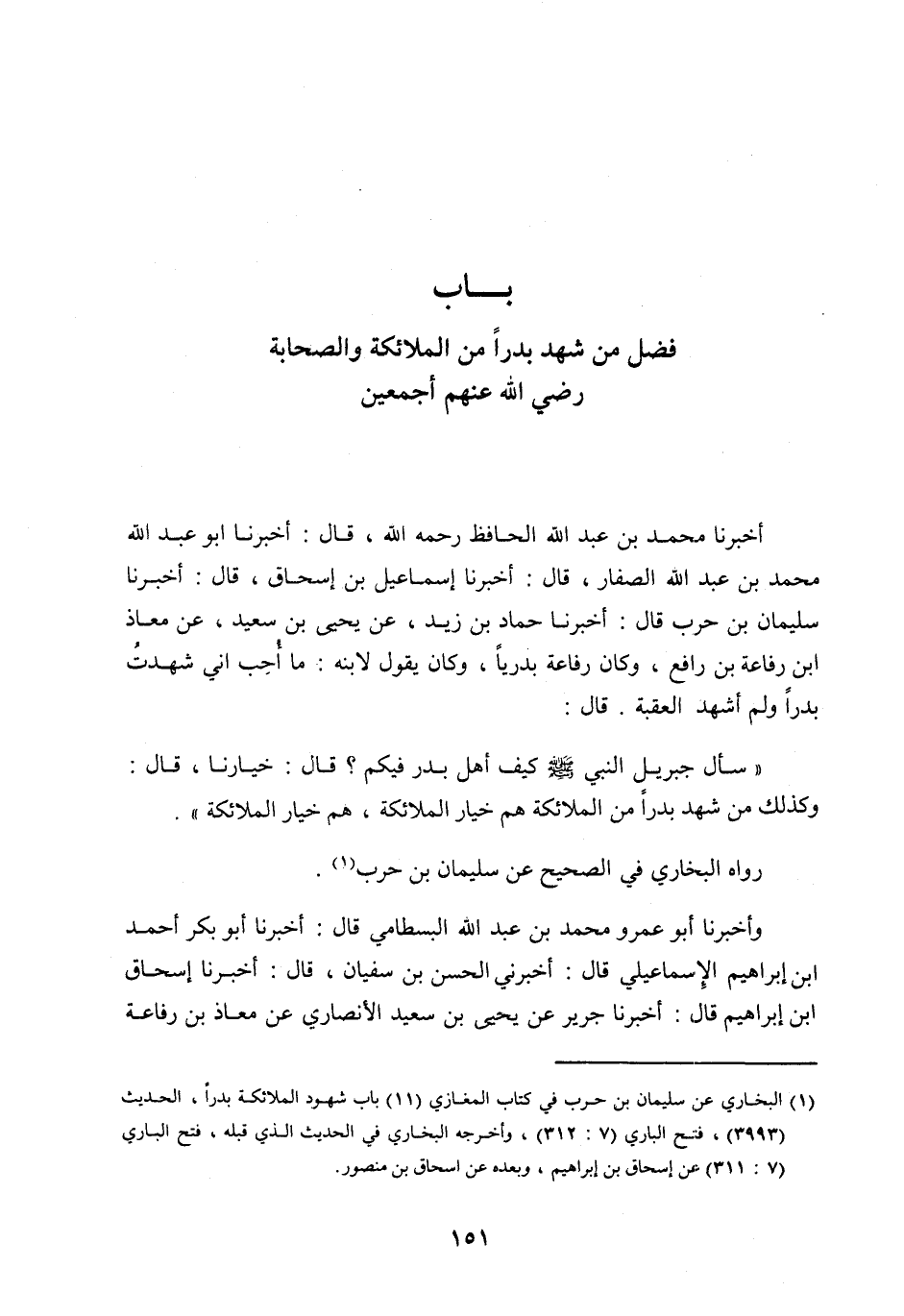 [ (1) ] الْبُخَارِيُّ عَنْ سُلَيْمَانَ بْنِ حَرْبٍ في كتاب المغازي (11) باب شهود الملائكة بدرا، الحديث (3993) ، فتح الباري (7: 312) ، وأخرجه البخاري في الحديث الذي قبله، فتح الباري (7: 311) عَنْ إِسْحَاقَ بْنِ إِبْرَاهِيمَ، وبعده عَنْ إِسْحَاقَ بْنِ مَنْصُورٍ.