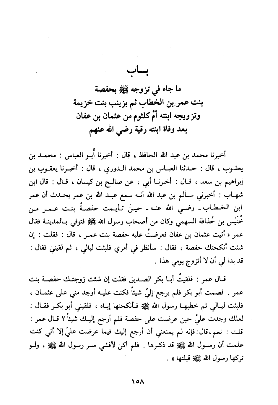 أَخْبَرَنَا مُحَمَّدُ بْنُ عَبْدِ اللَّه الْحَافِظُ، قَالَ: أَخْبَرَنَا أَبُو الْعَبَّاسِ: مُحَمَّدُ بْنُ يَعْقُوبَ، قَالَ: حَدَّثَنَا الْعَبَّاسُ بْنُ مُحَمَّدٍ الدُّورِيُّ، قَالَ: أَخْبَرَنَا يَعْقُوبُ بْنُ إِبْرَاهِيمَ بْنِ سَعْدٍ، قَالَ: أَخْبَرَنَا أَبِي، عَنْ صَالِحِ بْنِ كَيْسَانَ، قَالَ: قَالَ ابْنُ شِهَابٍ: أَخْبَرَنِي سَالِمُ بْنُ عَبْدِ اللَّه أَنَّهُ سَمِعَ عَبْدَ اللَّه بْنَ عُمَرَ يُحَدِّثُ أَنَّ عُمَرَ ابن الْخَطَّابٍ- رَضِيَ اللَّه عَنْهُ- حِينَ تَأَيَّمَتْ حَفْصَةُ بِنْتُ عُمَرَ مِنْ خُنَيْسِ بْنِ حُذَافَةَ السَّهْمِيِّ وَكَانَ مِنْ أَصْحَابِ رَسُولِ اللَّه صَلَّى اللَّه عَلَيْهِ وَسَلَّمَ فَتُوُفِّيَ بِالْمَدِينَةِ فَقَالَ عُمَرُ «أَتَيْتُ عُثْمَانَ بْنَ عَفَّانَ فَعَرَضْتُ عَلَيْهِ حَفْصَةَ بِنْتَ عُمَرَ، قَالَ: فَقُلْتُ: إِنْ شِئْتَ أَنْكَحْتُكَ حَفْصَةَ، فَقَالَ: سَأَنْظُرُ فِي أَمْرِي فَلَبِثْتُ لَيَالِيَ، ثُمَّ لَقِيَنِي فَقَالَ: