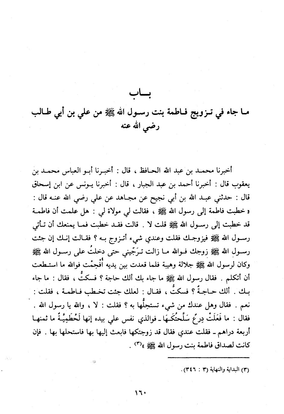 أَخْبَرَنَا مُحَمَّدُ بْنُ عَبْدِ اللَّه الْحَافِظُ، قَالَ: أَخْبَرَنَا أَبُو الْعَبَّاسِ مُحَمَّدُ بْنُ يَعْقُوبَ قَالَ: أَخْبَرَنَا أَحْمَدُ بْنُ عَبْدِ الْجَبَّارِ، قَالَ: أَخْبَرَنَا يُونُسُ عَنِ ابْنِ إِسْحَاقَ قَالَ: حَدَّثَنِي عَبْدُ اللَّه بن أبي نجيح عن مجاهد عَنْ عَلِيٍّ رَضِيَ اللَّه عَنْهُ قَالَ: «خُطِبَتْ فَاطِمَةُ إِلَى رَسُولِ اللَّه صَلَّى اللَّه عَلَيْهِ وَسَلَّمَ، فَقَالَتْ لِي مَوْلَاةٌ لِي: هَلْ عَلِمْتَ أَنَّ فَاطِمَةَ قَدْ خُطِبَتْ إِلَى رَسُولِ اللَّه صَلَّى اللَّه عَلَيْهِ وَسَلَّمَ قُلْتُ لَا. قَالَتْ فَقَدْ خُطِبَتْ فَمَا يَمْنَعُكَ أَنْ تَأْتِيَ رَسُولَ اللَّه صَلَّى اللَّه عَلَيْهِ وَسَلَّمَ فَيُزَوِّجَكَ فَقُلْتُ وَعِنْدِي شَيْءٌ أَتَزَوَّجُ بِهِ؟ فَقَالَتْ إِنِّكَ إِنْ جِئْتَ رَسُولَ اللَّه صَلَّى اللَّه عليه وسلم زوجك فو اللَّه مَا زَالَتْ تُرَجِّينِي حَتَّى دَخَلْتُ عَلَى رَسُولِ اللَّه صَلَّى اللَّه عَلَيْهِ وسلم وَكَانَ لِرَسُولِ اللَّه صَلَّى اللَّه عَلَيْهِ وَسَلَّمَ جَلَالَةٌ وَهَيْبَةٌ فَلَمَّا قَعَدْتُ بَيْنَ يديه أفحمت فو اللَّه مَا اسْتَطَعْتُ أَنْ أَتَكَلَّمَ. فَقَالَ رَسُولُ اللَّه صَلَّى اللَّه عَلَيْهِ وَسَلَّمَ مَا جَاءَ بِكَ أَلَكَ حَاجَةٌ؟ فَسَكَتُّ، فَقَالَ: مَا جَاءَ بِكَ. أَلَكَ حَاجَةٌ؟ فَسَكَتُّ، فَقَالَ: لَعَلَّكَ جِئْتَ تَخْطُبُ فَاطِمَةَ، فَقُلْتُ: