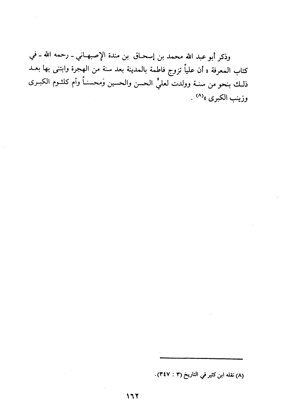 وَذَكَرَ أَبُو عَبْدِ اللَّه مُحَمَّدُ بْنُ إِسْحَاقَ بْنِ مَنْدَهِ الْأَصْبَهَانِيُّ- رَحِمَهُ اللَّه- فِي كِتَابِ الْمَعْرِفَةِ «أَنَّ عَلِيًّا تَزَوَّجَ فَاطِمَةَ بِالْمَدِينَةِ بَعْدَ سَنَةٍ مِنَ الْهِجْرَةِ وَابْتَنَى بِهَا بَعْدَ ذَلِكَ بِنَحْوٍ مِنْ سَنَةٍ وَوَلَدَتْ لِعَلِيٍّ الْحَسَنَ وَالْحُسَيْنَ وَمُحَسَّنًا وَأُمَّ كُلْثُومٍ الْكُبْرَى وَزَيْنَبَ الكبرى» [ (8) ] .