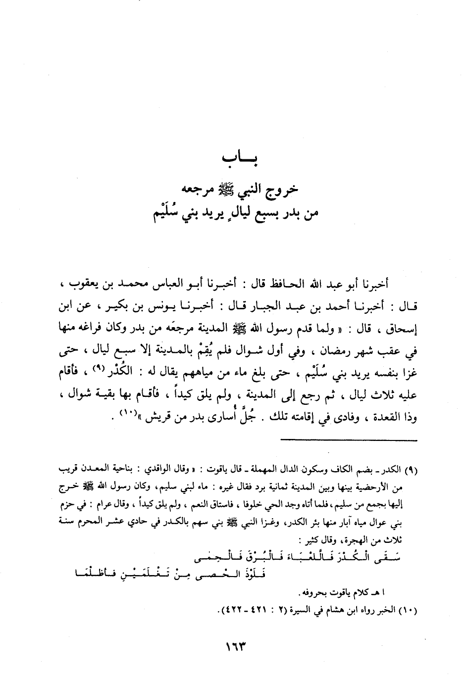 أَخْبَرَنَا أَبُو عَبْدِ اللَّه الْحَافِظُ قَالَ: أَخْبَرَنَا أَبُو الْعَبَّاسِ مُحَمَّدُ بْنُ يَعْقُوبَ، قَالَ: أَخْبَرَنَا أَحْمَدُ بْنُ عَبْدِ الْجَبَّارِ قَالَ: أَخْبَرَنَا يُونُسُ بْنُ بُكَيْرٍ، عَنِ ابْنِ إِسْحَاقَ، قَالَ: «ولَمَّا قَدِمَ رَسُولُ اللَّه صَلَّى اللَّه عَلَيْهِ وَسَلَّمَ الْمَدِينَةَ مَرْجِعَهُ مِنْ بَدْرٍ وَكَانَ فَرَاغُهُ مِنْهَا فِي عَقِبِ شَهْرِ رَمَضَانَ، وَفِي أَوَّلِ شَوَّالٍ فَلَمْ يَقُمْ بِالْمَدِينَةِ إِلَّا سَبْعَ لَيَالٍ، حَتَّى غَزَا بِنَفْسِهِ يُرِيدُ بَنِي سُلَيْمٍ، حَتَّى بَلَغَ مَاءً مِنْ مِيَاهِهِمْ يُقَالُ لَهُ: الْكُدْرُ [ (9) ] ، فَأَقَامَ عَلَيْهِ ثَلَاثَ لَيَالٍ، ثُمَّ رَجَعَ إِلَى الْمَدِينَةِ، وَلَمْ يَلْقَ كَيْدًا، فَأَقَامَ بِهَا بَقِيَّةَ شَوَّالٍ، وَذَا الْقَعْدَةِ، وَفَادَى فِي إِقَامَتِهِ تِلْكَ. جُلَّ أُسَارَى بَدْرٍ مِنْ قريش» [ (10) ] .