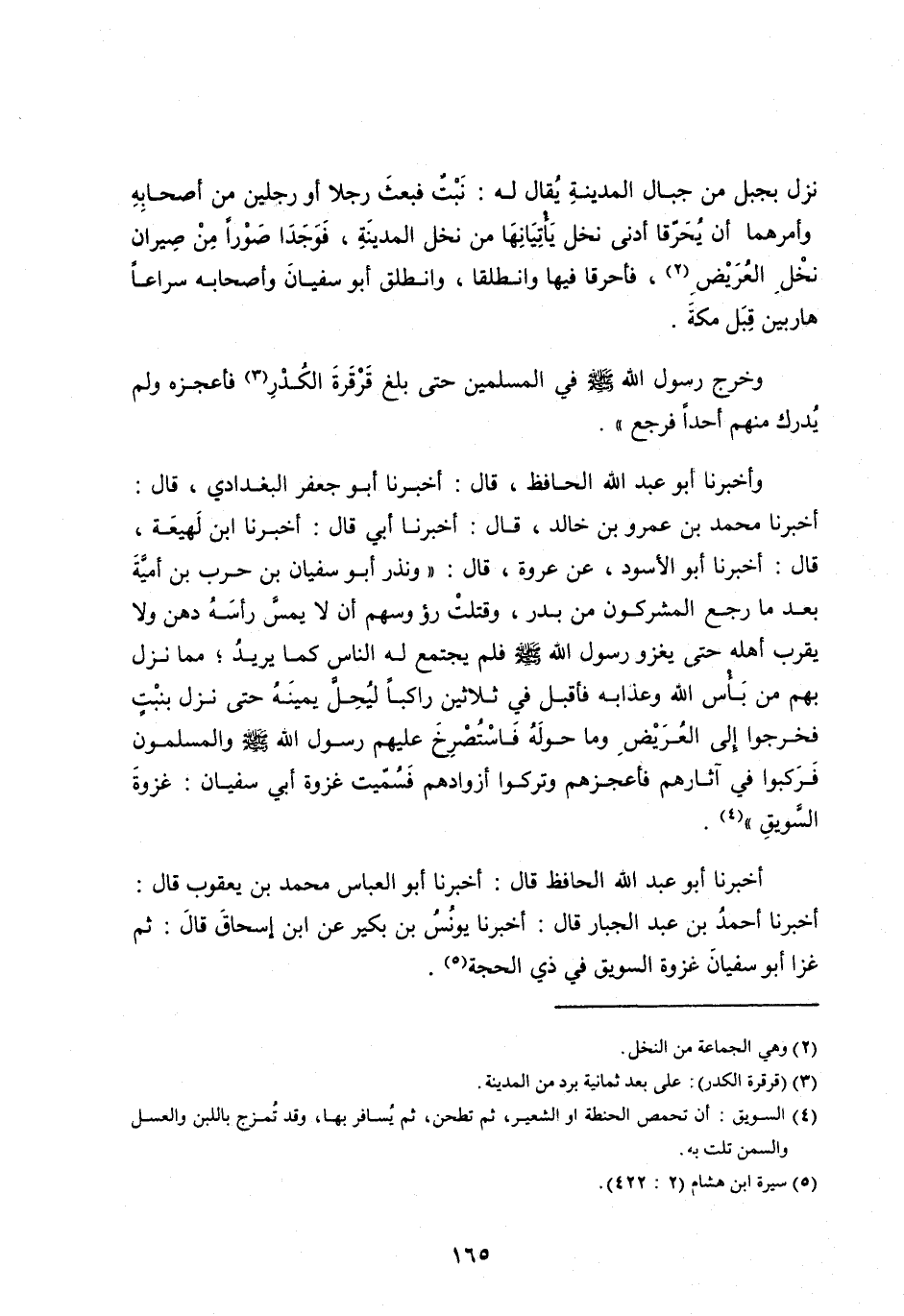 أَخْبَرَنَا أَحْمَدُ بْنُ عَبْدِ الْجَبَّارِ قَالَ: أَخْبَرَنَا يُونُسُ بْنُ بُكَيْرٍ عَنِ ابْنِ إِسْحَاقَ قَالَ: ثُمَّ غَزَا أَبُو سُفْيَانَ غَزْوَةَ السَّوِيقِ فِي ذِي الْحِجَّةِ [ (5) ] .