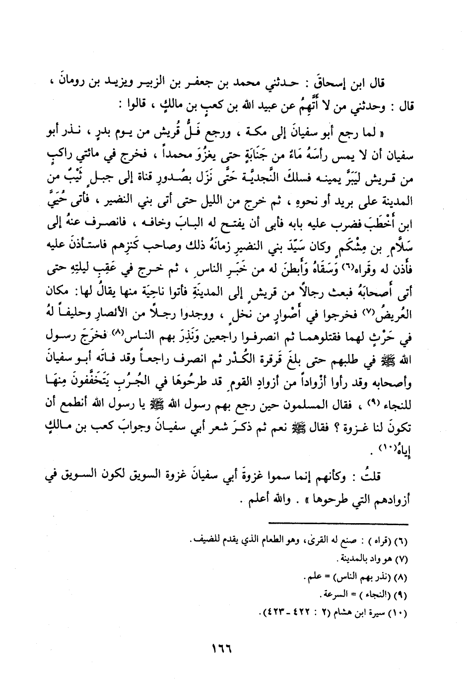 «لَمَّا رَجَعَ أَبُو سُفْيَانَ إِلَى مَكَّةَ، وَرَجَعَ فَلُّ قُرَيْشٍ مِنْ يَوْمِ بَدْرٍ، نَذَرَ أَبُو سُفْيَانَ أَنْ لَا يَمَسَّ رَأْسَهُ مَاءٌ مِنْ جَنَابَةٍ حَتَّى يَغْزُوَ مُحَمَّدًا، فَخَرَجَ فِي مِائَتَيْ رَاكِبٍ مِنْ قُرَيْشٍ لِيَبَرَّ يَمِينَهُ فَسَلَكَ النَّجْدِيَّةَ حَتَّى نَزَلَ بِصُدُورِ قَنَاةٍ إلى جبل ثيب مِنَ الْمَدِينَةِ عَلَى بَرِيدٍ أَوْ نَحْوِهِ، ثُمَّ خَرَجَ مِنَ اللَّيْلِ حَتَّى أَتَى بَنِي النَّضِيرِ، فَأَتَى حُيَيَّ ابن أَخْطَبَ فَضَرَبَ عَلَيْهِ بَابَهُ فَأَبَى أَنْ يَفْتَحَ لَهُ الْبَابَ وَخَافَهُ، فَانْصَرَفَ عَنْهُ إِلَى سَلَّامِ بْنِ مِشْكَمٍ وَكَانَ سَيِّدَ بَنِي النَّضِيرِ زَمَانَهُ ذَلِكَ وَصَاحِبَ كَنْزِهِمْ فَاسْتَأْذَنَ عَلَيْهِ فَأَذِنَ لَهُ وَقَرَاهُ [ (6) ] وَسَقَاهُ وَأَبْطَنَ لَهُ مِنْ خَبَرِ النَّاسِ، ثُمَّ خَرَجَ فِي عَقِبِ لَيْلَتِهِ حَتَّى أَتَى أَصْحَابَهُ فَبَعَثَ رِجَالًا مِنْ قُرَيْشٍ إِلَى الْمَدِينَةِ فَأَتَوْا نَاحِيَةً مِنْهَا يُقَالُ لَهَا: مَكَانُ الْعُرَيْضِ [ (7) ] فَخَرَجُوا فِي أَصْوَارٍ مِنْ نَخْلٍ، وَوَجَدُوا رَجُلًا مِنَ الْأَنْصَارِ وَحَلِيفًا لَهُ فِي حَرْثٍ لَهُمَا فَقَتَلُوهُمَا ثُمَّ انْصَرَفُوا رَاجِعِينَ وَنَذَرَ بِهِمُ النَّاسُ [ (8) ] فَخَرَجَ رَسُولُ اللَّه صَلَّى اللَّه عَلَيْهِ وَسَلَّمَ فِي طَلَبِهِمْ حَتَّى بَلَغَ قَرْقَرَةَ الْكُدْرِ ثُمَّ انْصَرَفَ رَاجِعًا وَقَدْ فَاتَهُ أَبُو سُفْيَانَ وَأَصْحَابُهُ وَقَدْ رَأَوْا أَزْوَادًا مِنْ أَزْوَادِ الْقَوْمِ قَدْ طَرَحُوهَا فِي الْجُرُبِ يَتَخَفَّفُونَ مِنْهَا لِلْنَجَاءِ [ (9) ] ،