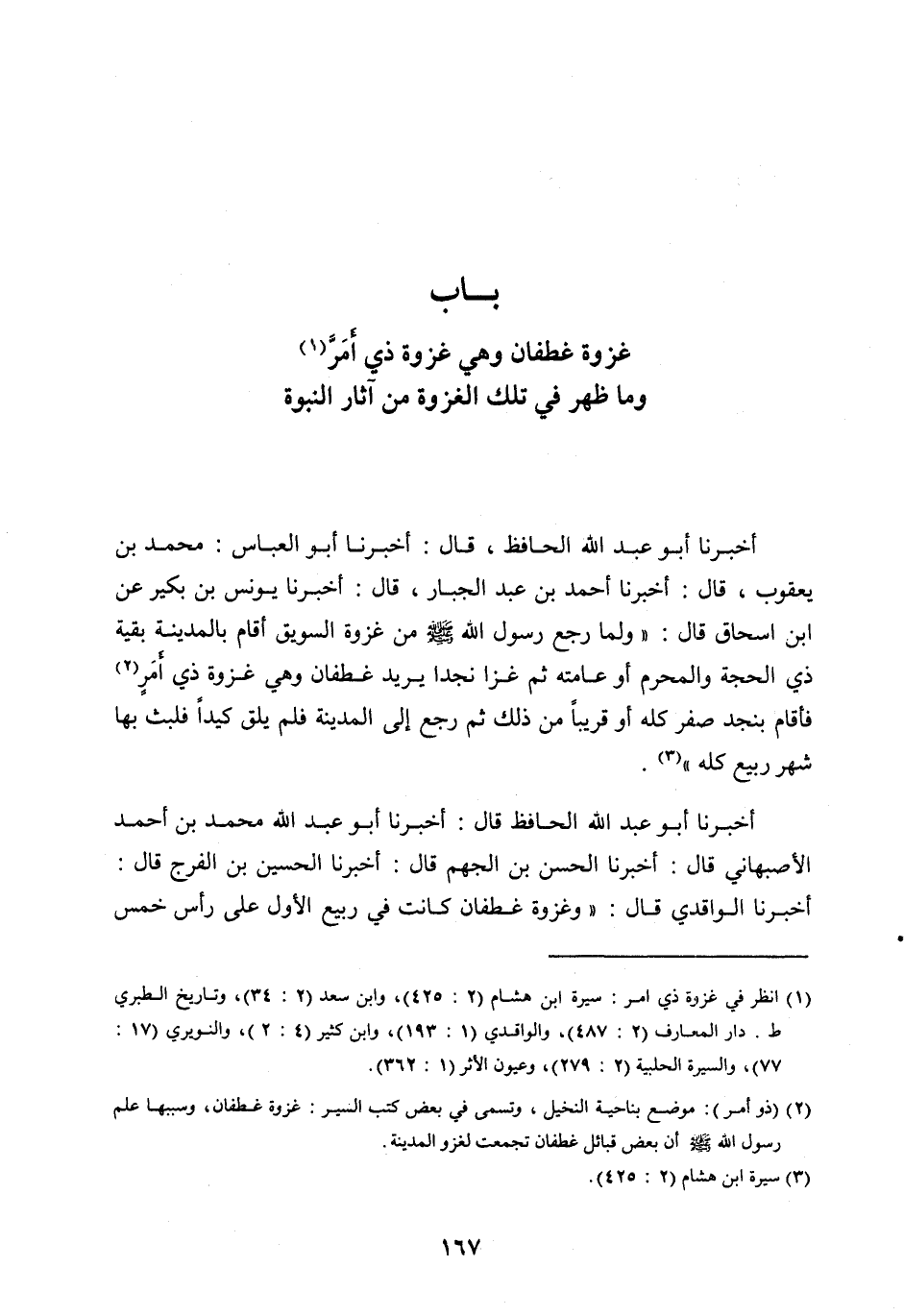 أَخْبَرَنَا أَبُو عَبْدِ اللَّه الْحَافِظُ، قَالَ: أَخْبَرَنَا أَبُو الْعَبَّاسِ: مُحَمَّدُ بْنُ يَعْقُوبَ، قَالَ: أَخْبَرَنَا أَحْمَدُ بْنُ عَبْدِ الْجَبَّارِ، قَالَ: أَخْبَرَنَا يُونُسُ بْنُ بُكَيْرٍ عَنِ ابْنِ إِسْحَاقَ قَالَ: «ولَمَّا رَجَعَ رَسُولُ اللَّه صَلَّى اللَّه عَلَيْهِ وَسَلَّمَ مِنْ غَزْوَةِ السَّوِيقِ أَقَامَ بِالْمَدِينَةِ بَقِيَّةَ ذِي الْحِجَّةِ وَالْمُحَرَّمَ أَوْ عَامَّتَهُ ثُمَّ غَزَا نَجْدًا يُرِيدُ غَطَفَانَ وَهِيَ غَزْوَةُ ذِي أَمَرَّ [ (2) ] فَأَقَامَ بِنَجْدٍ صَفَرَ كُلَّهُ أَوْ قَرِيبًا مِنْ ذَلِكَ ثُمَّ رَجَعَ إِلَى الْمَدِينَةِ فَلَمْ يَلْقَ كَيْدًا فَلَبِثَ بِهَا شَهْرَ رَبِيعٍ كُلَّهُ» [ (3) ] .