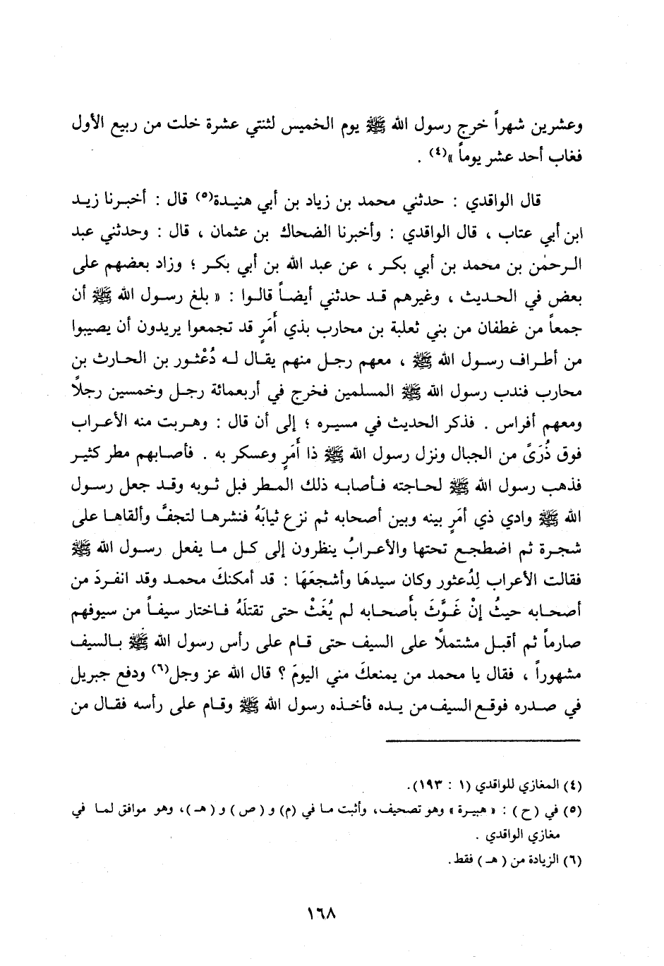 قَالَ الْوَاقِدِيُّ: حَدَّثَنِي مُحَمَّدُ بْنُ زِيَادِ بْنِ أَبِي هُنَيْدَةَ [ (5) ] قَالَ: أَخْبَرَنَا زَيْدُ ابن أَبِي عَتَّابٍ، قَالَ الْوَاقِدِيُّ: وَأَخْبَرَنَا الضَّحَّاكُ بْنُ عُثْمَانَ، قَالَ: وَحَدَّثَنِي عَبْدُ الرَّحْمَنِ بْنُ مُحَمَّدِ بْنِ أَبِي بَكْرٍ، عَنْ عَبْدِ اللَّه بْنِ أَبِي بَكْرٍ، وَزَادَ بَعْضُهُمْ عَلَى بَعْضٍ فِي الْحَدِيثِ، وَغَيْرُهُمْ قَدْ حَدَّثَنِي أَيْضًا قَالُوا: «بَلَغَ رَسُولَ اللَّه صلى اللَّه عليه وَسَلَّمَ أَنَّ جَمْعًا مِنْ غَطَفَانَ مِنْ بَنِي ثَعْلَبَةَ بْنِ مُحَارِبٍ بِذِي أَمَرَّ قَدْ تَجَمَّعُوا يُرِيدُونَ أَنْ يُصِيبُوا مِنْ أَطْرَافِ رَسُولِ اللَّه صَلَّى اللَّه عليه وَسَلَّمَ، مَعَهُمْ رَجُلٌ مِنْهُمْ يُقَالُ لَهُ دُعْثُورُ بْنُ الْحَارِثِ بْنِ مُحَارِبٍ فَنَدَبَ رَسُولُ اللَّه صَلَّى اللَّه عَلَيْهِ وَسَلَّمَ الْمُسْلِمِينَ فَخَرَجَ فِي أَرْبَعِمِائَةِ رَجُلٍ وَخَمْسِينَ رَجُلًا وَمَعَهُمْ أَفْرَاسٌ. فَذَكَرَ الْحَدِيثَ فِي مَسِيرِهِ، إِلَى أَنْ قَالَ: وَهَرَبَتْ مِنْهُ الْأَعْرَابُ فَوْقَ ذُرًى مِنَ الْجِبَالِ وَنَزَلَ رَسُولُ اللَّه صَلَّى اللَّه عَلَيْهِ وَسَلَّمَ ذَا أَمَرَّ وَعَسْكَرَ بِهِ. فَأَصَابَهُمْ مَطَرٌ كَثِيرٌ فَذَهَبَ رَسُولُ اللَّه صَلَّى اللَّه عَلَيْهِ وَسَلَّمَ لِحَاجَتِهِ فَأَصَابَهُ ذَلِكَ الْمَطَرُ فَبَلَّ ثَوْبَهُ وَقَدْ جَعَلَ رَسُولُ اللَّه صَلَّى اللَّه عليه وسلم وَادِيَ ذِي أَمَرَّ بَيْنَهُ وَبَيْنَ أَصْحَابِهِ ثُمَّ نَزَعَ ثِيَابَهُ فَنَشَرَهَا لِتَجِفَّ وَأَلْقَاهَا عَلَى شَجَرَةٍ ثُمَّ اضْطَجَعَ تَحْتَهَا وَالْأَعْرَابُ يَنْظُرُونَ إِلَى كُلِّ مَا يَفْعَلُ رَسُولُ اللَّه صلى اللَّه عليه وَسَلَّمَ فَقَالَتِ الْأَعْرَابُ لِدُعْثُورٍ وَكَانَ سَيِّدَهَا وَأَشْجَعَهَا: قَدْ أَمْكَنَكَ مُحَمَّدٌ وَقَدِ انْفَرَدَ مِنْ أَصْحَابِهِ حَيْثُ إِنْ غَوَّثَ بِأَصْحَابِهِ لَمْ يُغَثْ حَتَّى تَقْتُلَهُ فَاخْتَارَ سَيْفًا مِنْ سُيوفِهِمْ صَارِمًا ثُمَّ أَقْبَلَ مُشْتَمِلًا عَلَى السَّيْفِ حَتَّى قَامَ عَلَى رَأْسِ رَسُولِ اللَّه صَلَّى اللَّه عَلَيْهِ وَسَلَّمَ بِالسَّيْفِ مَشْهُورًا، فَقَالَ يَا مُحَمَّدُ مَنْ يَمْنَعُكَ مِنِّي الْيَوْمَ؟ قَالَ اللَّه عَزَّ وَجَلَّ [ (6) ] وَدَفَعَ جِبْرِيلُ فِي صَدْرِهِ فَوَقَعَ السَّيْفُ مِنْ يَدِهِ فَأَخَذَهُ رَسُولُ اللَّه صَلَّى اللَّه عَلَيْهِ وَسَلَّمَ وَقَامَ عَلَى رأسه فقال من