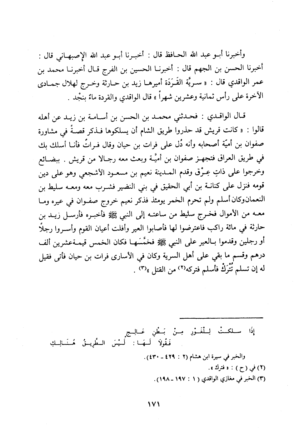 قَالَ الْوَاقِدِيُّ: فَحَدَّثَنِي مُحَمَّدُ بْنُ الْحَسَنِ بْنِ أُسَامَةَ بْنِ زَيْدٍ عَنْ أَهْلِهِ قَالُوا: «كَانَتْ قُرَيْشٌ قَدْ حَذِرُوا طَرِيقَ الشَّامِ أَنْ يَسْلُكُوهَا فَذَكَرَ قِصَّةً فِي مُشَاوَرَةِ صَفْوَانَ بْنِ أُمَيَّةَ أَصْحَابَهُ وَأَنَّهُ دَلَّ عَلَى فُرَاتِ بْنِ حَيَّانَ وَقَالَ فُرَاتٌ فَأَنَا أَسْلُكَ بِكَ فِي طَرِيقِ الْعِرَاقِ فَتَجَهَّزَ صَفْوَانُ بْنُ أُمَيَّةَ وَبَعَثَ مَعَهُ رِجَالًا مِنْ قُرَيْشٍ. بِبَضَائِعَ وَخَرَجُوا عَلَى ذَاتِ عِرْقٍ وَقَدِمَ الْمَدِينَةَ نُعَيْمُ بْنُ مَسْعُودٍ الْأَشْجَعِيُّ وَهُوَ عَلَى دِينِ قَوْمِهِ فَنَزَلَ عَلَى كِنَانَةَ بْنِ أَبِي الْحُقَيْقِ فِي بَنِي النَّضِيرِ فَشَرِبَ مَعَهُ وَمَعَهُ سَلِيطُ بْنُ النُّعْمَانِ وَكَانَ أَسْلَمَ وَلَمْ تُحَرَّمِ الْخَمْرُ يَوْمَئِذٍ فَذَكَرَ نُعَيْمٌ خُرُوجَ صَفْوَانَ فِي عِيرِهِ وَمَا مَعَهُ مِنَ الْأَمْوَالِ فَخَرَجَ سَلِيطُ مِنْ سَاعَتِهِ إِلَى النَّبِيِّ صَلَّى اللَّه عليه وسلم فَأَخْبَرَهُ فَأَرْسَلَ زَيْدُ بْنُ حَارِثَةَ فِي مِائَةِ رَاكِبٍ فَاعْتَرَضُوا لَهَا فَأَصَابُوا الْعِيرَ وَأَفْلَتَ أَعْيَانُ الْقَوْمِ وَأَسَرُوا رَجُلًا أَوْ رَجُلَيْنِ وَقَدِمُوا بِالْعِيرِ عَلَى النَّبِيِّ صَلَّى اللَّه عَلَيْهِ وَسَلَّمَ فَخَمَّسَهَا فَكَانَ الْخُمُسُ قِيمَةَ عِشْرِينَ أَلْفَ دِرْهَمٍ وَقَسَّمَ مَا بَقِيَ عَلَى أَهْلِ السَّرِيَّةِ وَكَانَ فِي الْأُسَارَى فُرَاتُ بْنُ حَيَّانَ فَأَتَى فَقِيلَ لَهُ إِنْ تُسْلِمْ تُتْرَكْ فَأَسْلَمَ فَتَرَكَهُ [ (2) ] مِنَ الْقَتْلِ» [ (3) ] .