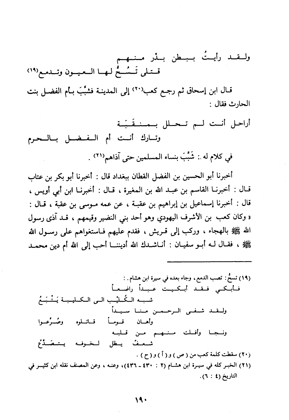 قَالَ ابْنُ إِسْحَاقَ ثُمَّ رَجَعَ كَعْبٌ [ (20) ] إِلَى الْمَدِينَةِ فَشَبَّبَ بِأُمِّ الْفَضْلِ بِنْتِ الْحَارِثِ فَقَالَ: