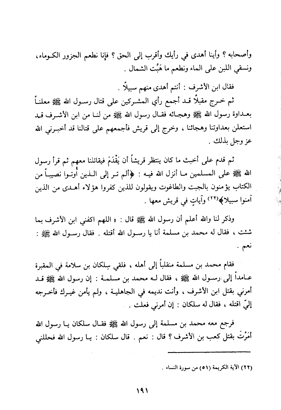 وَذُكِرَ لَنَا واللَّه أَعْلَمُ أَنَّ رَسُولَ اللَّه صَلَّى اللَّه عَلَيْهِ وَسَلَّمَ قَالَ: «اللهُمَّ اكْفِنِي ابْنَ الْأَشْرَفِ بِمَا شِئْتَ، فَقَالَ لَهُ مُحَمَّدُ بْنُ مَسْلَمَةَ أَنَا يَا رَسُولَ اللَّه أَقْتُلُهُ. فَقَالَ رَسُولُ اللَّه صَلَّى اللَّه عَلَيْهِ وَسَلَّمَ: