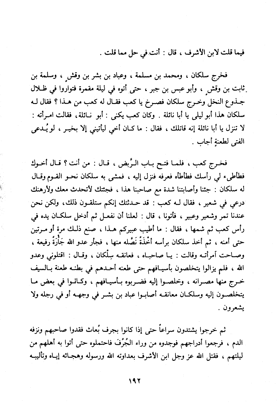 فَخَرَجَ كَعْبٌ، فَلَمَّا فَتَحَ بَابَ الرَّبَضِ، قَالَ: مَنْ أَنْتَ؟ قَالَ أَخُوكَ فَطَأْطِئْ لِي رَأْسَكَ فَطَأْطَأَهُ فَعَرَفَهُ فَنَزَلَ إِلَيْهِ، فَمَشَى بِهِ سِلْكَانُ نَحْوَ الْقَوْمِ وَقَالَ لَهُ سِلْكَانُ: جِئْنَا وَأَصَابَتْنَا شِدَّةٌ مَعَ صَاحِبِنَا هَذَا، فَجِئْتُكَ لِأَتَحَدَّثَ مَعَكَ وَلِأُرْهِنَكَ دِرْعِي فِي شَعِيرٍ، فَقَالَ لَهُ كَعْبٌ: قَدْ حَدَّثْتُكَ أَنَّكُمْ سَتَلْقَوْنَ ذَلِكَ، وَلَكِنْ نَحْنُ عِنْدَنَا تَمْرٌ وَشَعِيرٌ وَعَبِيرٌ، فَأْتُونَا، قَالَ: لَعَلَّنَا أَنْ نَفْعَلَ ثُمَّ أَدْخَلَ سِلْكَانُ يَدَهُ فِي رَأْسِ كَعْبٍ ثُمَّ شَمَّهَا، فَقَالَ: مَا أَطْيَبَ عَبِيرَكُمْ هَذَا، صَنَعَ ذَلِكَ مَرَّةً أَوْ مَرَّتَيْنِ حَتَّى أَمِنَهُ، ثُمَّ أَخَذَ سِلْكَانُ بِرَأْسِهِ أَخْذَةً نَصَّلَهُ مِنْهَا، فَجَأَرَ عَدُوُّ اللَّه جَأْرَةً رَفِيعَةً، وَصَاحَتِ امْرَأَتُهُ وَقَالَتْ: يَا صَاحِبَاهُ، فَعَانَقَهُ سِلْكَانُ، وَقَالَ: اقْتُلُونِي وَعَدُوَّ اللَّه، فَلَمْ يَزَالُوا يَتَخَلَّصُونَ بِأَسْيَافِهِمْ حَتَّى طَعَنَهُ أَحَدُهُمْ فِي بَطْنِهِ طَعْنَةً بِالسَّيْفِ خَرَجَ مِنْهَا مُصْرَانُهُ، وَخَلَصُوا إِلَيْهِ فَضَرَبُوهُ بِأَسْيَافِهِمْ، وَكَانُوا فِي بَعْضِ مَا يَتَخَلَّصُونَ إِلَيْهِ وَسِلْكَانُ مُعَانِقُهُ أَصَابُوا عَبَّادَ بْنَ بِشْرٍ فِي وَجْهِهِ أَوْ فِي رِجْلِهِ وَلَا يَشْعُرُونَ.