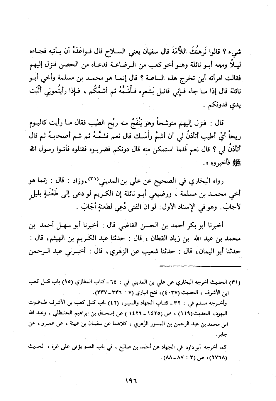 [ (31) ] الحديث أخرجه الْبُخَارِيُّ عَنْ عَلِيِّ بْنِ الْمَدِينِيِّ في: 64- كتاب المغازي (15) باب قتل كعب ابن الأشرف، الحديث (4037) ، فتح الباري (7: 336- 337) .