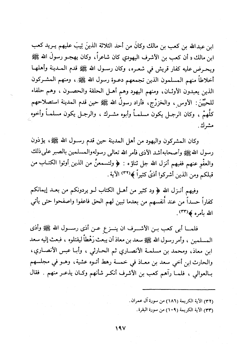 ابْنَ عَبْدِ اللَّه بْنِ كَعْبِ بْنِ مَالِكٍ وَكَانَ مِنْ أَحَدِ الثَّلَاثَةِ الَّذِينَ تِيبَ عَلَيْهِمْ يُرِيدُ كَعْبَ ابن مَالِكٍ «أَنَّ كَعْبَ بْنَ الْأَشْرَفِ الْيَهُودِيَّ كَانَ شَاعِرًا، وَكَانَ يَهْجُو رَسُولَ اللَّه صلى اللَّه عليه وسلم وَيُحَرِّضُ عَلَيْهِ كُفَّارَ قُرَيْشٍ فِي شِعْرِهِ، وَكَانَ رَسُولُ اللَّه صَلَّى اللَّه عَلَيْهِ وَسَلَّمَ قَدِمَ الْمَدِينَةَ وَأَهْلُهَا أخلاطا مِنْهُمُ الْمُسْلِمُونَ الَّذِينَ تَجْمَعُهُمْ دَعْوَةُ رَسُولِ اللَّه صلى اللَّه عَلَيْهِ وَسَلَّمَ، وَمِنْهُمُ الْمُشْرِكُونَ الَّذِينَ يَعْبُدُونَ الْأَوْثَانَ، وَمِنْهُمُ الْيَهُودُ وَهُمْ أَهْلُ الْحَلْقَةِ وَالْحُصُونِ، وَهُمْ حُلَفَاءُ لِلْحَيَّيْنِ: الْأَوْسِ، وَالْخَزْرَجِ، فَأَرَادَ رسول اللَّه صلى اللَّه عَلَيْهِ وَسَلَّمَ حِينَ قَدِمَ الْمَدِينَةَ اسْتِصْلَاحَهُمْ كُلَّهُمْ، وَكَانَ الرَّجُلُ يَكُونُ مُسْلِمًا وَأَبُوهُ مُشْرِكٌ، وَالرَّجُلُ يَكُونُ مُسْلِمًا وَأَخُوهُ مُشْرِكٌ.