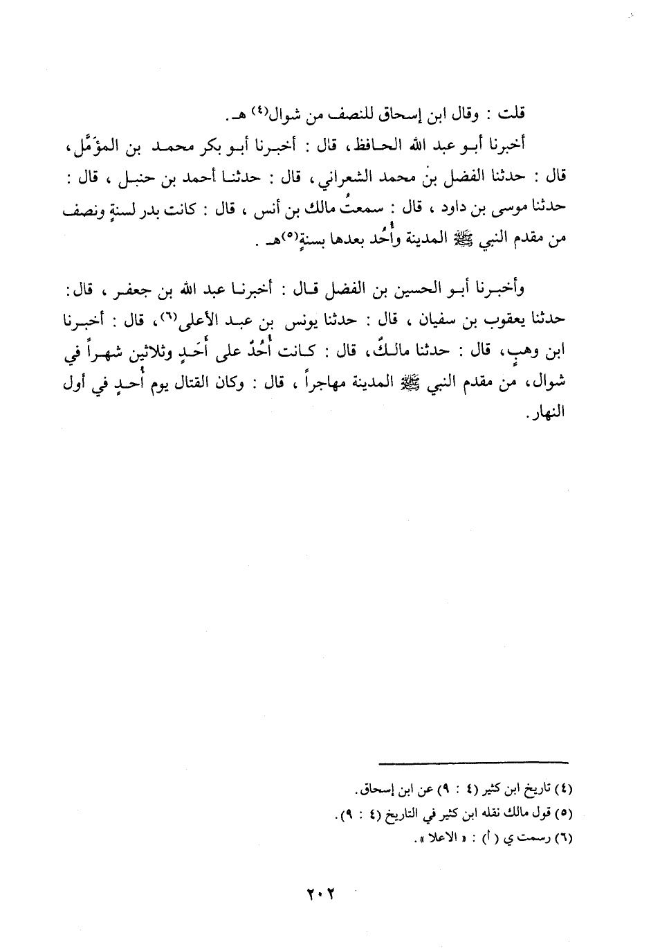 حَدَّثَنَا مُوسَى بْنُ دَاوُدَ، قَالَ: سَمِعْتُ مَالِكَ بْنَ أَنَسٍ، قَالَ: كَانَتْ بَدْرٍ لِسَنَةٍ وَنِصْفٍ مِنْ مَقْدَمِ النبي صلى اللَّه عليه وَسَلَّمَ الْمَدِينَةَ وَأُحُدٌ بَعْدَهَا بسنة [ (5) ] هـ.