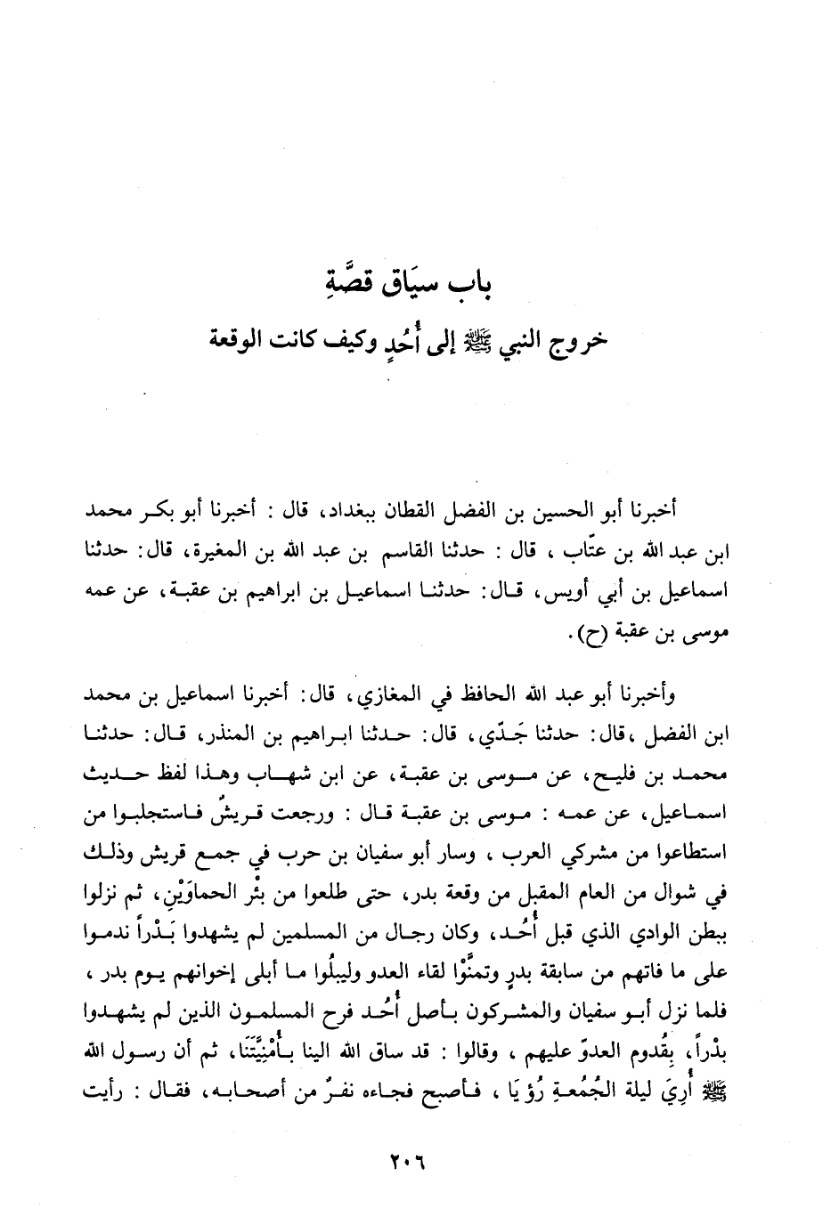 وأَخْبَرَنَا أَبُو عَبْدِ اللَّه الْحَافِظُ فِي الْمَغَازِي، قَالَ: أَخْبَرَنَا إِسْمَاعِيلُ بْنُ محمد ابن الْفَضْلِ، قَالَ: حَدَّثَنَا جَدِّي، قَالَ: حَدَّثَنَا إِبْرَاهِيمُ بْنُ الْمُنْذِرِ، قَالَ: حَدَّثَنَا مُحَمَّدُ بْنُ فُلَيْحٍ، عَنْ مُوسَى بْنِ عُقْبَةَ، عَنِ ابْنِ شِهَابٍ وَهَذَا لَفْظُ حَدِيثِ إِسْمَاعِيلَ، عَنْ عَمِّهِ: مُوسَى بْنِ عُقْبَةَ قَالَ: وَرَجَعَتْ قُرَيْشٌ فَاسْتَجْلَبُوا مَنِ اسْتَطَاعُوا مِنْ مُشْرِكِي الْعَرَبِ، وَسَارَ أَبُو سُفْيَانَ بْنُ حَرْبٍ فِي جَمْعِ قُرَيْشٍ وَذَلِكَ فِي شَوَّالٍ مِنَ الْعَامِ الْمُقْبِلِ مِنْ وَقْعَةِ بَدْرٍ، حَتَّى طَلَعُوا مِنْ بِئْرِ الحاوين، ثُمَّ نَزَلُوا بِبَطْنِ الْوَادِي الَّذِي قَبْلَ أُحُدٍ، وَكَانَ رِجَالٌ مِنَ الْمُسْلِمِينَ لَمْ يَشْهَدُوا بَدْرًا نَدِمُوا عَلَى مَا فَاتَهُمْ مِنْ سَابِقَةِ بَدْرٍ وَتَمَنَّوْا لِقَاءَ الْعَدُوِّ وَلِيُبْلُوا مَا أَبْلَى إِخْوَانُهُمْ يَوْمَ بَدْرٍ، فَلَمَّا نَزَلَ أَبُو سُفْيَانَ وَالْمُشْرِكُونَ بِأَصْلِ أُحُدٍ فَرِحَ الْمُسْلِمُونَ الَّذِينَ لَمْ يَشْهَدُوا بَدْرًا، بِقُدُومِ الْعَدُوِّ عَلَيْهِمْ، وَقَالُوا: قَدْ سَاقَ اللَّه إِلَيْنَا بِأُمْنِيَّتِنَا، ثُمَّ إِنَّ رَسُولَ اللَّه صَلَّى اللَّه عَلَيْهِ وسلم أُرِيَ لَيْلَةَ الْجُمُعَةِ رُؤْيَا، فَأَصْبَحَ فَجَاءَهُ نَفَرٌ مِنْ أَصْحَابِهِ، فَقَالَ: رَأَيْتُ