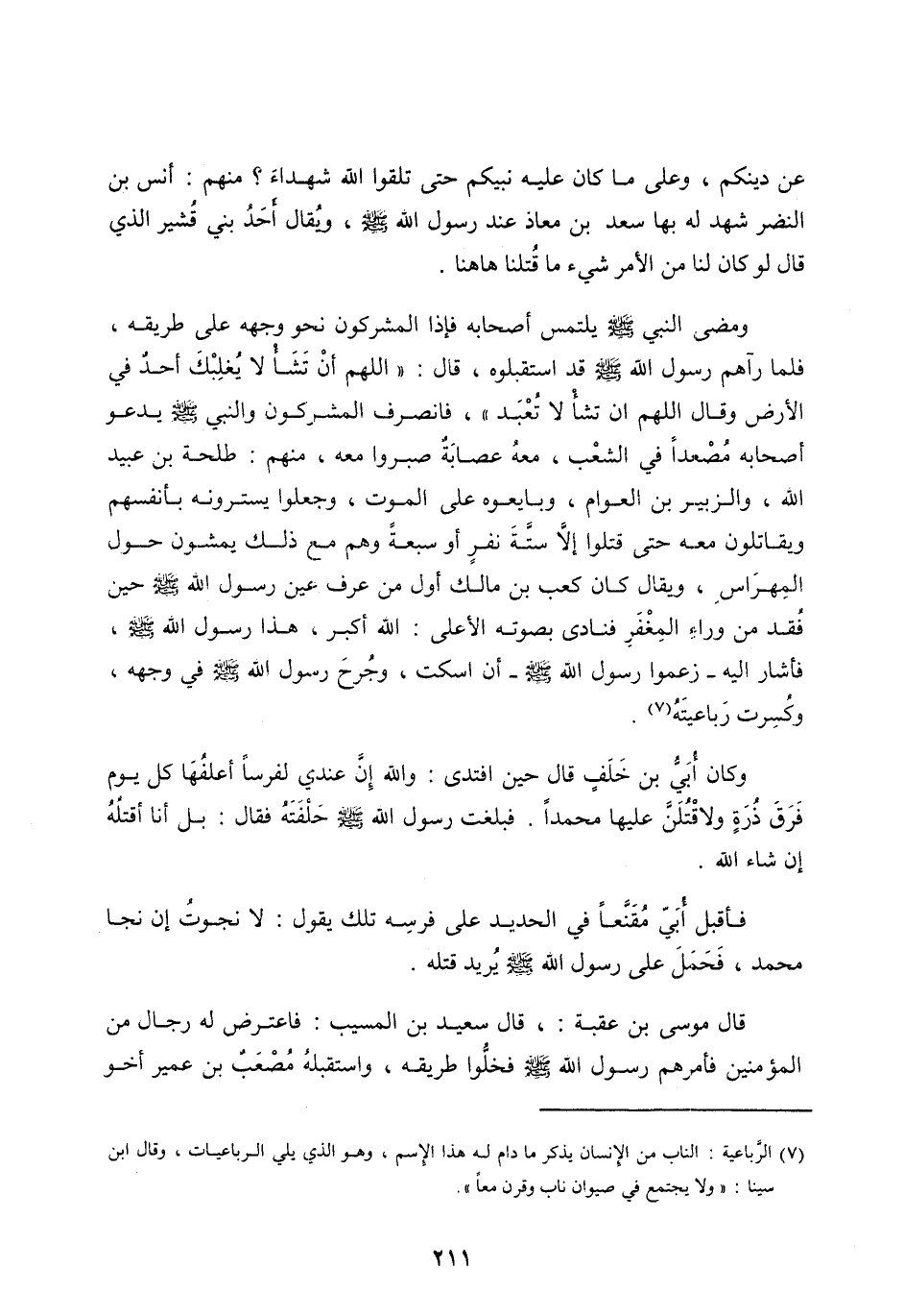 عَنْ دِينِكُمْ، وَعَلَى مَا كَانَ عَلَيْهِ نَبِيُّكُمْ حَتَّى تَلْقَوُا اللهَ شُهَدَاءَ؟ مِنْهُمْ: أَنَسُ بْنُ النَّضْرِ شَهِدَ لَهُ بِهَا سَعْدُ بْنُ مُعَاذٍ عِنْدَ رَسُولِ اللهِ صلى اللَّه عَلَيْهِ وَسَلَّمَ، وَيُقَالُ أَحَدُ بَنِي قُشَيْرٍ الَّذِي قَالَ لَوْ كَانَ لَنَا مِنَ الْأَمْرِ شَيْءٌ مَا قُتِلْنَا هَاهُنَا.