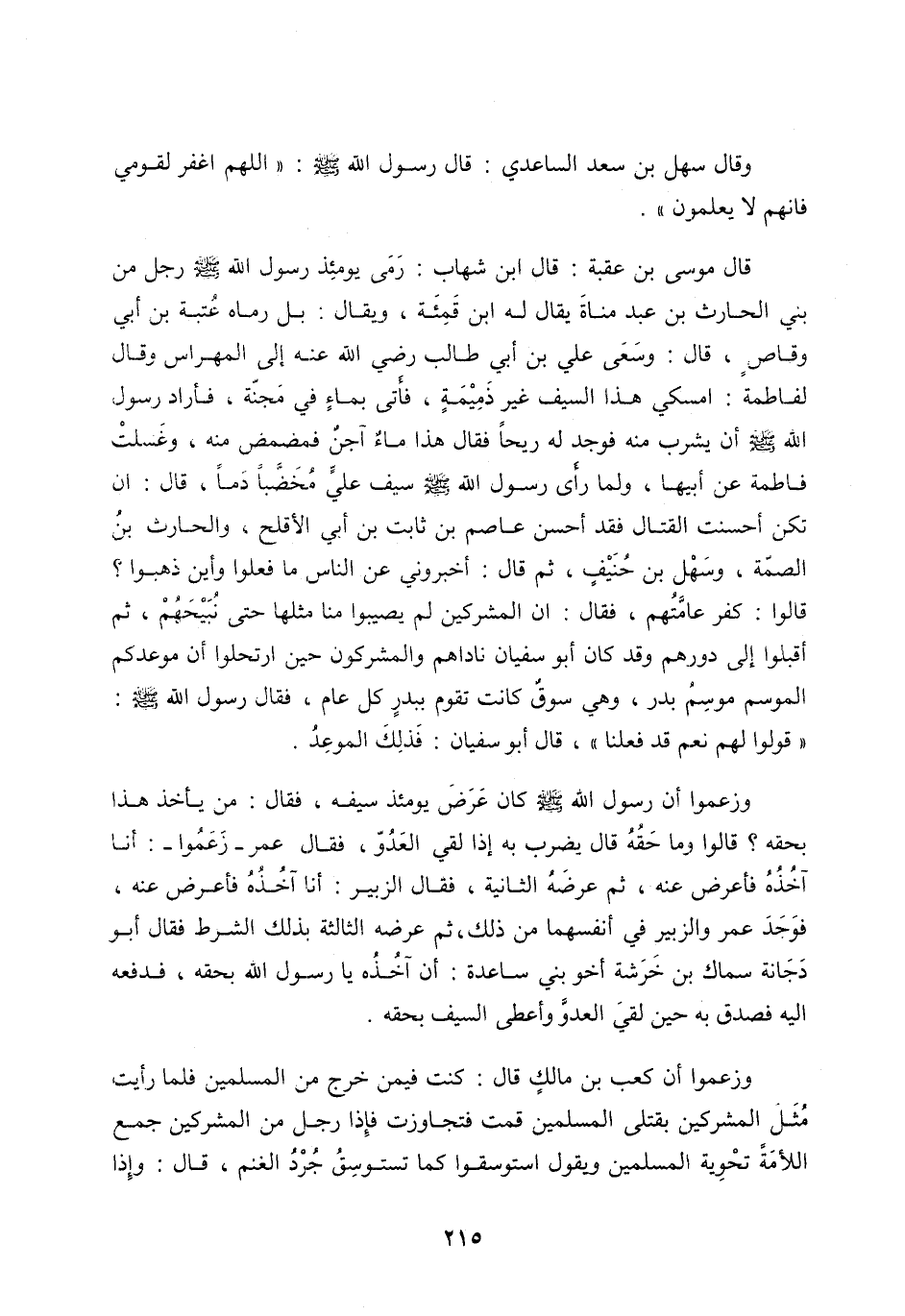 وزَعَمُوا أَنَّ رَسُولَ اللَّه صَلَّى اللَّه عَلَيْهِ وَسَلَّمَ كَانَ عَرَضَ يَوْمَئِذٍ سيفه، فقال: من يأخذها بِحَقِّهِ؟ قَالُوا وَمَا حَقُّهُ قَالَ يَضْرِبُ بِهِ إِذَا لَقِيَ الْعَدُوَّ،