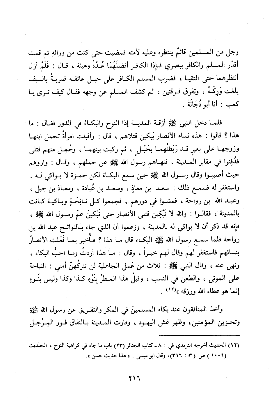 فَلَمَّا دَخَلَ النَّبِيُّ صَلَّى اللَّه عَلَيْهِ وَسَلَّمَ أَزِقَّةَ الْمَدِينَةِ إِذَا النَّوْحُ وَالْبُكَاءُ فِي الدُّورِ فَقَالَ: مَا هَذَا؟ قَالُوا: هَذِهِ نِسَاءُ الْأَنْصَارِ يَبْكِينَ قَتْلَاهُمْ، قَالَ: وَأَقْبَلَتِ امْرَأَةٌ تَحْمِلُ ابْنَهَا وَزَوْجَهَا عَلَى بَعِيرٍ قَدْ رَبَطَتْهُمَا بِحَبْلٍ، ثُمَّ رَكِبَتْ بَيْنَهُمَا، وَحُمِلَ مِنْهُمْ قَتْلَى فَدُفِنُوا فِي مَقَابِرِ الْمَدِينَةِ، فَنَهَاهُمْ رَسُولُ اللَّه صلى اللَّه عليه وَسَلَّمَ عَنْ حَمْلِهِمْ، وَقَالَ: وَارُوهُمْ حَيْثُ أُصِيبُوا وَقَالَ رَسُولُ اللَّه صَلَّى اللَّه عَلَيْهِ وَسَلَّمَ حِينَ سَمِعَ الْبُكَاءَ لَكِنَّ حَمْزَةَ لَا بَوَاكِيَ لَهُ.