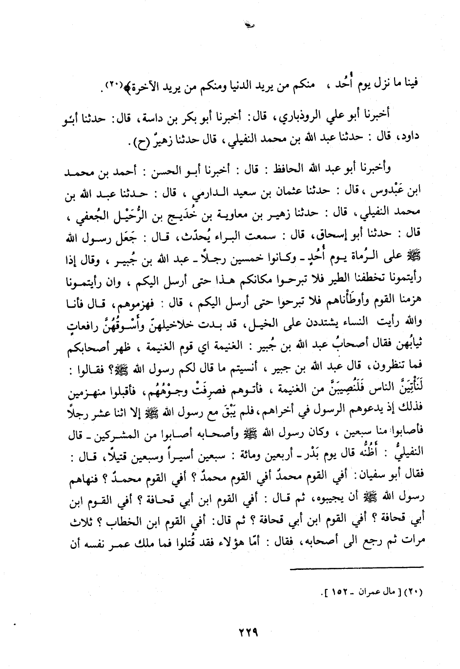 وَأَخْبَرَنَا أَبُو عَبْدِ اللَّه الْحَافِظُ: قَالَ: أَخْبَرَنَا أَبُو الْحَسَنِ: أَحْمَدُ بْنُ محمد ابن عَبْدُوسٍ، قَالَ: حَدَّثَنَا عُثْمَانُ بْنُ سَعِيدٍ الدَّارِمِيُّ، قَالَ: حَدَّثَنَا عَبْدُ اللَّه بْنُ مُحَمَّدٍ النُّفَيْلِيُّ، قَالَ: حَدَّثَنَا زُهَيْرُ بْنُ مُعَاوِيَةَ بْنِ خديج بْنِ الرُّحَيْلِ الْجُعْفِيُّ، قَالَ: حَدَّثَنَا أَبُو إِسْحَاقَ، قَالَ: سَمِعْتُ الْبَرَاءَ يُحَدِّثُ، قَالَ: جَعَلَ رَسُولُ اللَّه صَلَّى اللَّه عَلَيْهِ وسلم على الرُّمَاةَ يَوْمَ أُحُدٍ- وَكَانُوا خَمْسِينَ رَجُلًا- عَبْدَ اللَّه بْنَ جُبَيْرٍ، وَقَالَ إِذَا رَأَيْتُمُونَا تَخْطَفُنَا الطَّيْرُ فَلَا تَبْرَحُوا مَكَانَكُمْ هَذَا حَتَّى أُرْسِلَ إِلَيْكُمْ، وَإِنْ رَأَيْتُمُونَا هَزَمْنَا الْقَوْمَ وَأَوْطَأْنَاهُمْ فَلَا تَبْرَحُوا حَتَّى أُرْسِلَ إِلَيْكُمْ، قَالَ: فَهَزَمُوهُمْ، قَالَ فَأَنَا واللَّه رَأَيْتُ النِّسَاءَ يَشْتَدِدْنَ عَلَى الْخَيْلِ، قَدْ بَدَتْ خَلَاخِيلُهُنَّ وَأَسْوُقُهُنَّ رَافِعَاتٍ ثِيَابَهُنَّ فَقَالَ أَصْحَابُ عَبْدِ اللَّه بْنِ جُبَيْرٍ: الْغَنِيمَةَ أَيْ قَوْمِ الْغَنِيمَةَ، ظَهَرَ أَصْحَابُكُمْ فَمَا تَنْظُرُونَ، قَالَ عَبْدُ اللَّه بْنُ جُبَيْرٍ: أَنَسِيتُمْ مَا قَالَ لَكُمْ رَسُولُ اللَّه صَلَّى اللَّه عَلَيْهِ وَسَلَّمَ؟ فَقَالُوا: