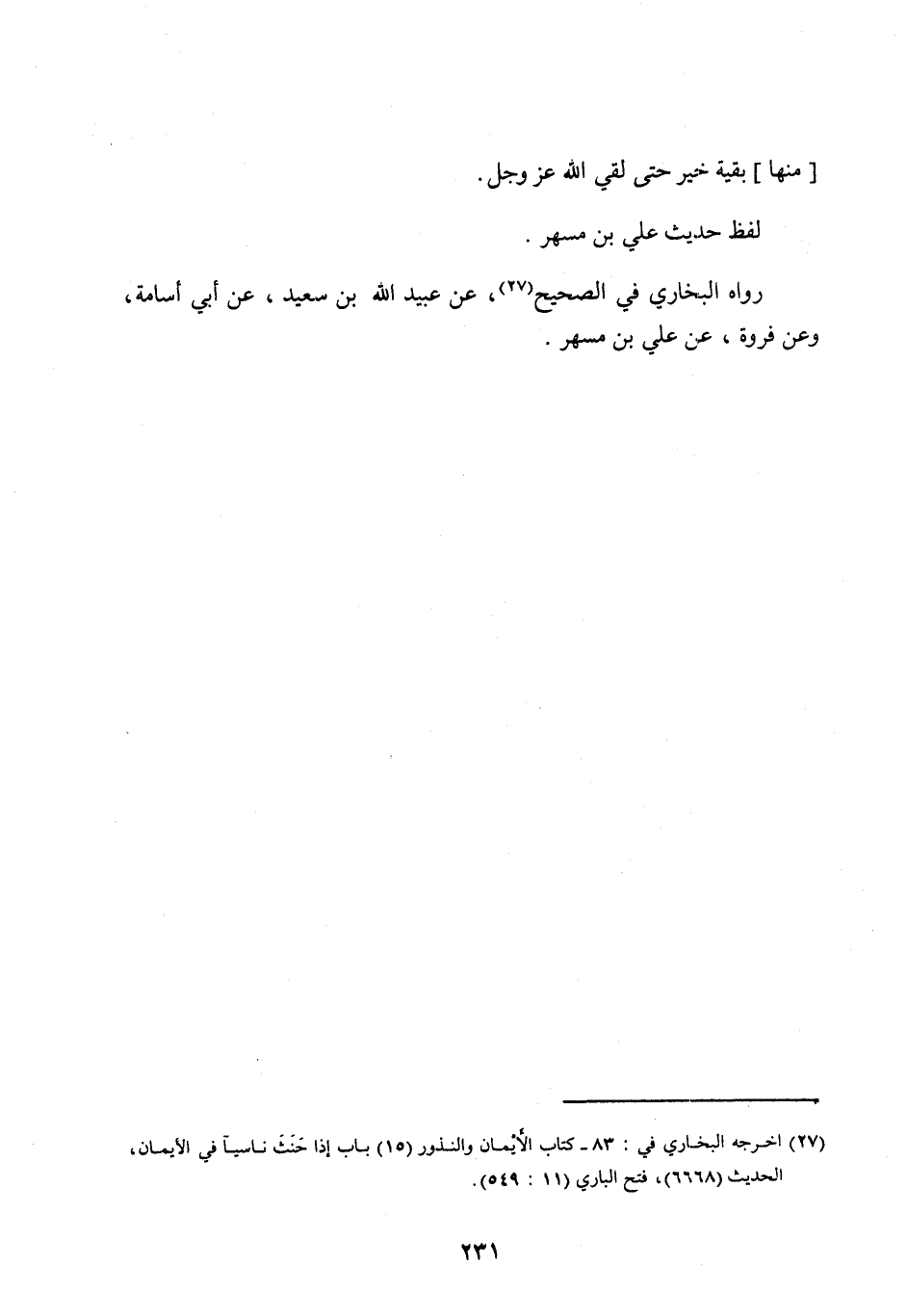رَوَاهُ الْبُخَارِيُّ فِي الصَّحِيحِ [ (27) ] ، عَنْ عُبَيْدِ اللهِ بْنِ سَعِيدٍ، عن أبي أُسَامَةَ، وَعَنْ فَرْوَةَ، عَنْ علي بن مسهر.