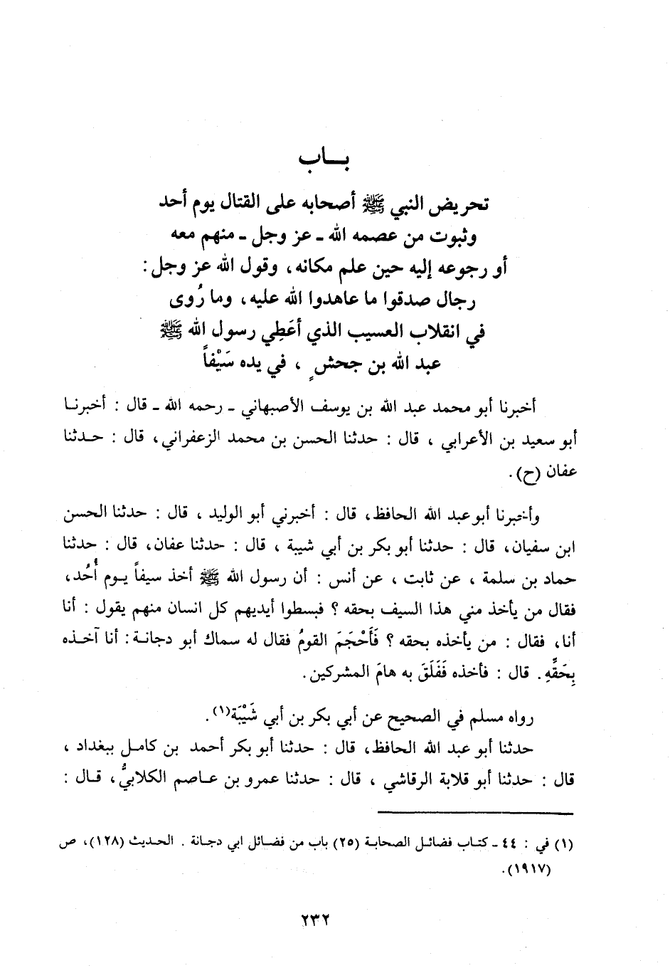 [ (1) ] فِي: 44- كِتَابِ فَضَائِلِ الصَّحَابَةِ (25) باب من فضائل ابي دجانة. الحديث (128) ، ص (1917) .