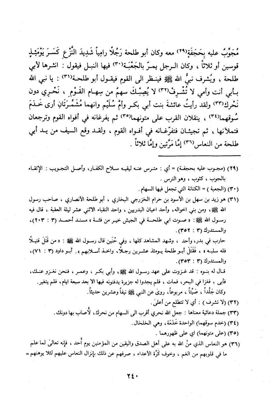 مُجَوِّبٌ عَلَيْهِ بِحَجَفَةٍ [ (29) ] مَعَهُ وَكَانَ أَبُو طَلْحَةَ رَجُلًا رَامِيًا شَدِيدَ النَّزْعِ كَسَرَ يَوْمَئِذٍ قَوْسَيْنِ أَوْ ثَلَاثًا، وَكَانَ الرَّجُلُ يَمُرُّ بِالْجَعْبَةِ [ (30) ] فِيهَا النَّبْلُ فَيَقُولُ: انْثُرْهَا لِأَبِي طَلْحَةَ، وَيُشْرِفُ نَبِيُّ اللَّه صلى اللَّه عليه وَسَلَّمَ فَيَنْظُرُ إِلَى الْقَوْمِ فَيَقُولُ أَبُو طَلْحَةَ [ (31) ] : يَا نَبِيَّ اللَّه بِأَبِي أَنْتَ وَأُمِّي لَا تُشْرِفْ [ (32) ] لَا يُصِبْكَ سَهْمٌ مِنْ سِهَامِ الْقَوْمِ، نَحْرِي دُونَ نَحْرِكَ [ (33) ] وَلَقَدْ رَأَيْتُ عَائِشَةَ بِنْتَ أَبِي بَكْرٍ وَأُمَّ سُلَيْمٍ وَإِنَّهُمَا مُشَمِّرَتَانِ أَرَى خَدَمَ سُوقِهِمَا [ (34) ] ، يَنْقُلَانِ الْقِرَبَ عَلَى مُتُونِهِمَا [ (35) ] ثُمَّ يُفْرغَانِهِ فِي أَفْوَاهِ الْقَوْمِ وَتَرْجِعَانِ فَتَمْلَآنِهَا، ثُمَّ تَجِيئَانِ فَتُفْرِغَانِهِ فِي أَفْوَاهِ الْقَوْمِ، وَلَقَدْ وَقَعَ السَّيْفُ مِنْ يَدِ أَبِي طَلْحَةَ مِنَ النُّعَاسِ [ (36) ] إِمَّا مرّتين وإمّا ثلاثا.