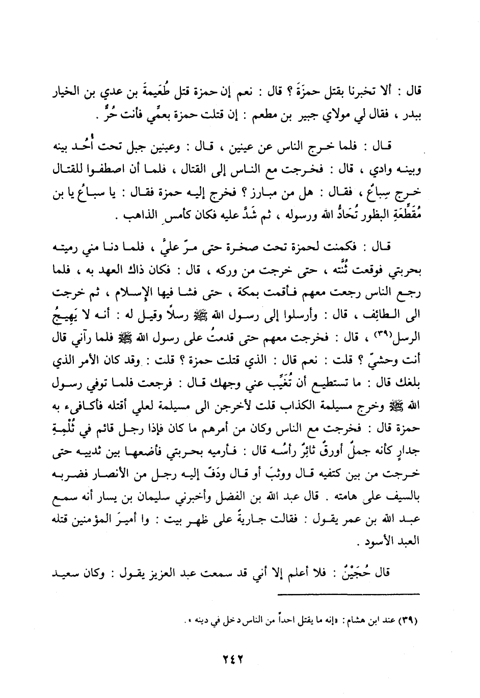 قَالَ: فَكَمَنْتُ لِحَمْزَةَ تَحْتَ صَخْرَةٍ حَتَّى مَرَّ عَلَيَّ، فَلَمَّا دَنَا مِنِّي رَمَيْتُهُ بِحَرْبَتِي فَوَقَعَتْ ثُنَّتُهُ، حَتَّى خَرَجَتْ مِنْ وَرِكِهِ، قَالَ: فَكَانَ ذَاكَ الْعَهْدَ بِهِ، فَلَمَّا رَجَعَ النَّاسُ رَجَعْتُ مَعَهُمْ فَأَقَمْتُ بِمَكَّةَ، حَتَّى فَشَا فِيهَا الْإِسْلَامُ، ثُمَّ خَرَجْتُ إِلَى الطَّائِفِ، قَالَ: وَأَرْسَلُوا إِلَى رَسُولِ اللهِ صَلَّى اللَّه عَلَيْهِ وَسَلَّمَ رُسُلًا وَقِيلَ لَهُ: إِنَّهُ لَا يَهِيجُ الرُّسُلَ [ (39) ] ،