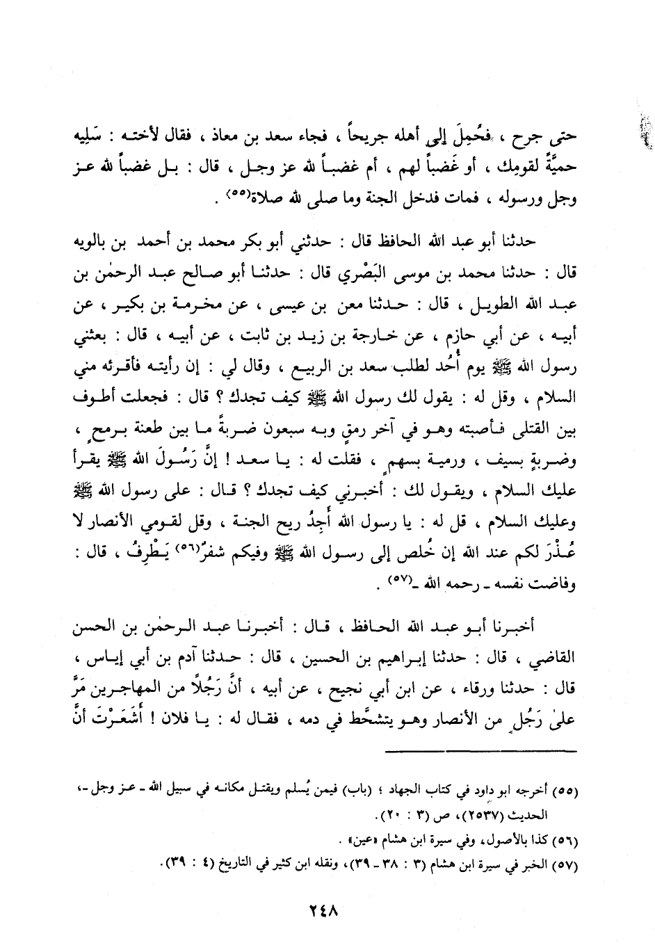 حَدَّثَنَا أَبُو عَبْدِ اللَّه الْحَافِظُ قَالَ: حَدَّثَنِي أَبُو بَكْرٍ مُحَمَّدُ بْنُ أَحْمَدَ بْنِ بَالَوَيْهِ قَالَ: حَدَّثَنَا مُحَمَّدُ بْنُ مُوسَى الْبَصْرِيُّ قَالَ: حَدَّثَنَا أَبُو صَالِحٍ عَبْدُ الرَّحْمَنِ بْنُ عَبْدِ اللَّه الطَّوِيلُ، قَالَ: حَدَّثَنَا مَعْنُ بْنُ عِيسَى، عَنْ مَخْرَمَةَ بْنِ بُكَيْرٍ، عَنْ أَبِيهِ، عَنْ أَبِي حَازِمٍ، عَنْ خَارِجَةَ بْنِ زَيْدِ بْنِ ثَابِتٍ، عَنْ أَبِيهِ، قَالَ: بَعَثَنِي رَسُولُ اللَّه صَلَّى اللَّه عَلَيْهِ وَسَلَّمَ يَوْمَ أُحُدٍ لِطَلَبِ سَعْدِ بْنِ الرَّبِيعِ، وَقَالَ لِي: إِنْ رَأَيْتَهُ فَأَقْرِئْهُ مِنِّي السَّلَامَ، وَقُلْ لَهُ: يَقُولُ لَكَ رَسُولُ اللَّه صَلَّى اللَّه عَلَيْهِ وَسَلَّمَ كَيْفَ تَجِدُكَ؟ قَالَ: فَجَعَلْتُ أَطُوفُ بَيْنَ الْقَتْلَى فَأَصَبْتُهُ وَهُوَ فِي آخِرِ رَمَقٍ وَبِهِ سَبْعُونَ ضَرْبَةً مَا بَيْنَ طَعْنَةٍ بِرُمْحٍ، وَضَرْبَةٍ بِسَيْفٍ، وَرَمْيَةٍ بِسَهْمٍ، فَقُلْتُ لَهُ: يَا سَعْدُ! إِنَّ رَسُولَ اللَّه صَلَّى اللَّه عَلَيْهِ وَسَلَّمَ يَقْرَأُ عَلَيْكَ السَّلَامَ، وَيَقُولُ لَكَ: أَخْبِرْنِي كَيْفَ تَجِدُكَ؟ قَالَ: عَلَى رَسُولِ اللَّه صلى اللَّه عَلَيْهِ وَسَلَّمَ وَعَلَيْكَ السَّلَامُ، قُلْ لَهُ: يَا رَسُولَ اللَّه أَجِدُ رِيحَ الْجَنَّةِ، وَقُلْ لِقَوْمِيَ الْأَنْصَارِ لَا عُذْرَ لَكُمْ عِنْدَ اللَّه إِنْ خُلِصَ إِلَى رَسُولِ اللَّه صَلَّى اللَّه عليه وَسَلَّمَ وَفِيكُمْ شُفْرٌ [ (56) ] يَطْرِفُ، قَالَ: